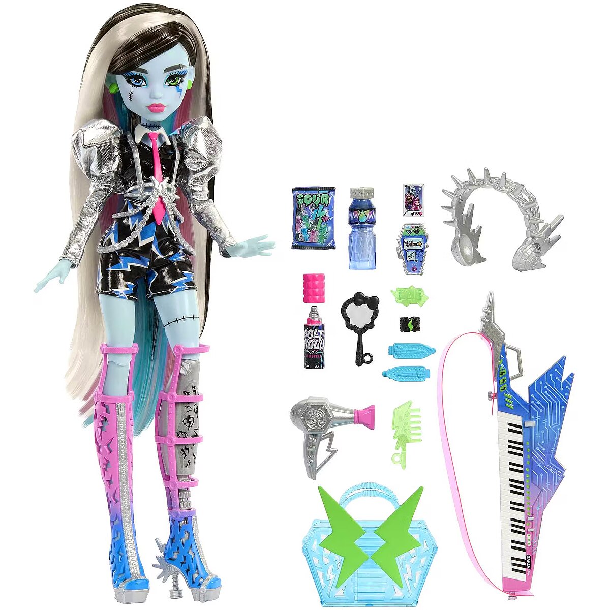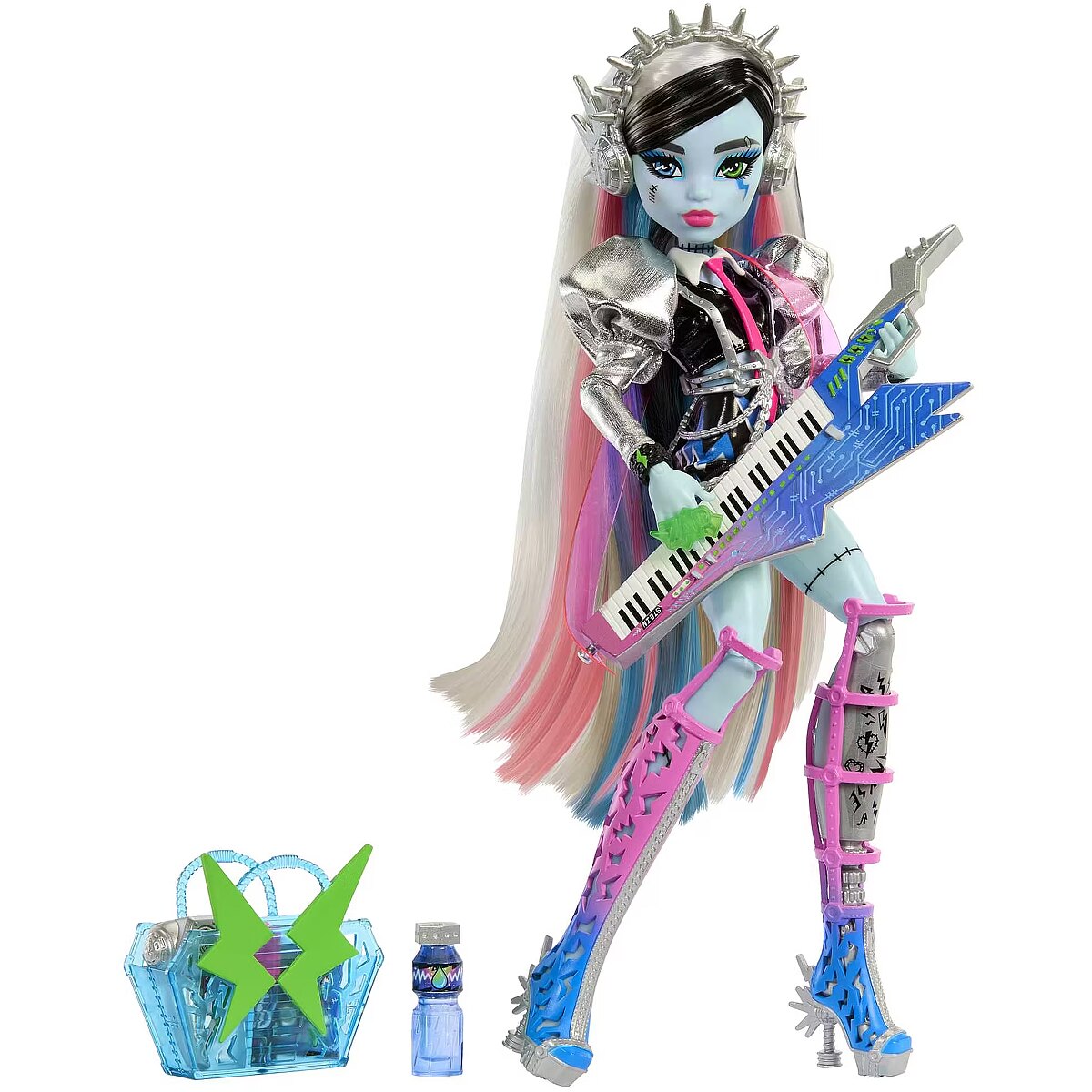 Packaging content - Packaging content - Includes 1 Frankie Stein doll, 1 keytar instrument with removable strap, 1 pair of headphones, 1 tote bag and assorted accessories. Doll cannot stand alone. Colours and decorations may vary.