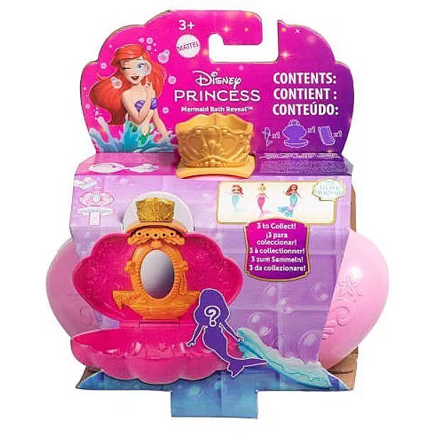 LongSummaryDescription - Disney Princess Mermaid Bath Reveal Small Dolls, Surprise Shell Playsets with Slide Accessories. Doll type: Mini doll, Doll's gender: Female, Recommended age (min): 3 yr(s), Suggested gender: Boy/Girl. Height: 129 mm, Weight: 160 g. Material: Plastic, Product colour: Multicolour