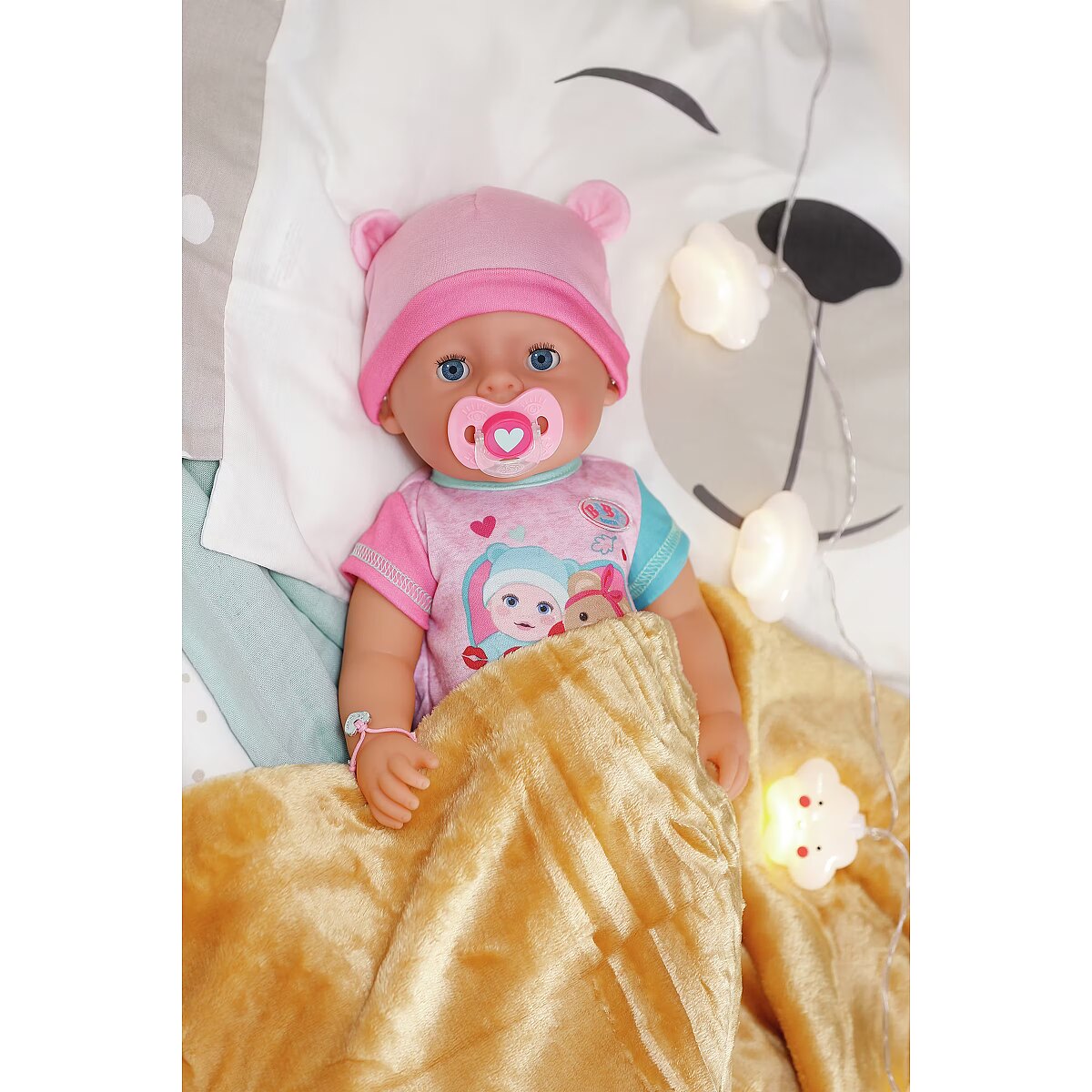 LongDesc - Here comes Emma! Already known from the BABY born animation series, which can be seen on YouTube and Toggo, Emma is now also available in her new outfit and with 10 accessories for you at home. She also has her magic plate with her: if you put water on the insert in the plate, the water magic makes delicious dishes appear, making the feeding game even more exciting. If you place her on her potty after playing with food (with water) or drink and press on her tummy, her small and large dishes will also appear there. If Emma drinks water from her bottle, she can even cry and needs to be gently comforted. The magic dummy helps here: if you turn it 180 degrees, her eyes close or open. Turn it again and the opposite happens. If you put her to sleep in her cot, she closes her eyes even without a dummy. But Emma can do even more: she is super manoeuvrable and can even be taken into the bath because she now dries even faster: to clean the doll properly after playtime, the leg can be removed to create a larger opening for cleaning. This makes it much easier for water to drain away. For even more creative play, in addition to her bottle, dummy, plate, spoon, meals and potty, Emma also comes with a nappy, her birth passport and two friendship bracelets - for a long and loving friendship between child and doll.In the usual BABY born quality that has been delighting generations of children since 1991.