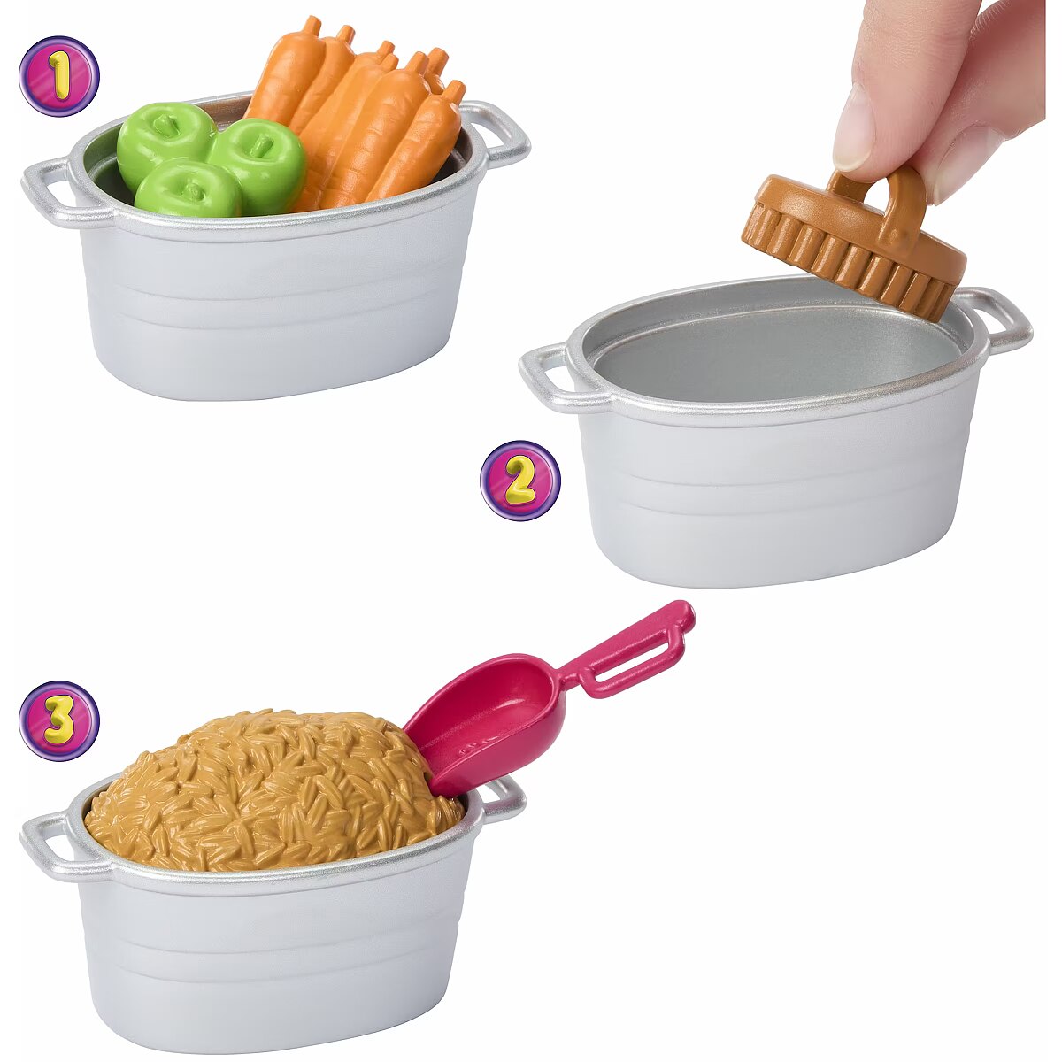 Packaging content - Packaging content - Includes 1 horse, 3 hair clips, 1 rose hair accessory, carrots, apples, 1 trophy, 1 scooper, 1 feeding bin, 1 comb, 1 brush, 1 pile of grains.