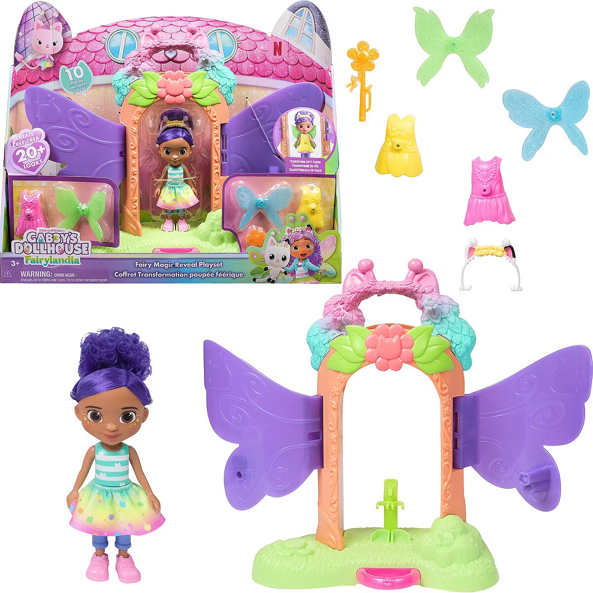 LongDesc - Step into the magical world of Gabby's Dollhouse with the Celebration Figure Gift Set! This exclusive figure set features Gabby and her favorite kitties like Pandy Paws, DJ Catnip, Catrat, Pillow Cat & Kitty Fairy! Then, unbox your very own dollhouse delivery to unveil the surprise toy, a delightful cape! For an added surprise, scan the QR code in the Dollhouse Delivery to unlock a special reward in the free Gabby’s Dollhouse App, available on iOS & Android. Gabby’s Dollhouse toys for girls & boys are great gifts for kids who are fans of the hit Netflix series and enjoy building pretend play doll house worlds. Make their entry into dollhouse play memorable with a world of lovable toy figures, dollhouse accessories and dollhouse furniture to collect and configure! Build your world with house kit essentials like a play kitchen or a music room, and tons of items to collect, like an awesome cruise ship toy, a mermaid themed pool and the all-new Party Room Playset - dollhouse attic with an indoor skate park, and super cute dollhouse balconies with mini fidget toys, that provide satisfying sensory play, and work seamlessly with both versions of the dollhouse!Includes: 1 Gabby Figure, 1 Pandy Paws Figure, 1 Catrat Figure, 1 DJ Catnip Figure, 1 Kitty Fairy Figure, 1 Pillow Cat, 1 Dollhouse Delivery, 1 Accessory