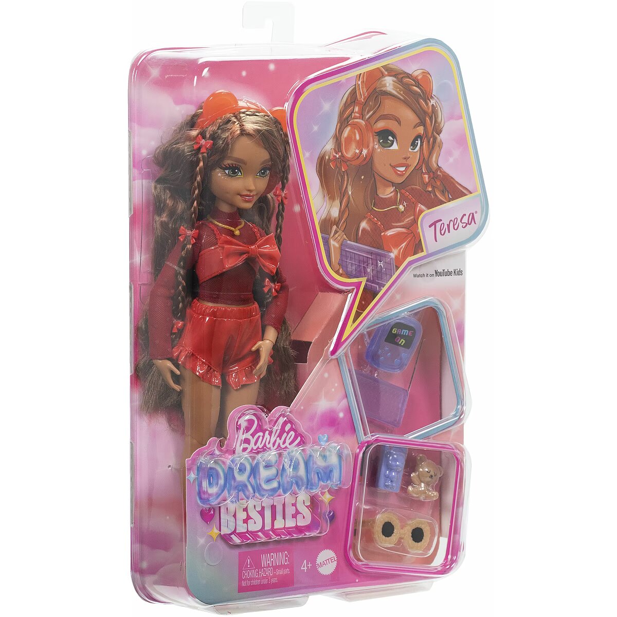 Packaging content - Packaging content - Includes 1 Barbie Dream Besties Teresa doll wearing a red lace top, red bow top, red shorts, and shoes, 5 hair clips, 1 headphones, 1 sunglasses, 1 phone, 1 phone case, 1 keyboard, 1 backpack, and 1 other accessory. Doll cannot stand alone. Colours and decorations may vary.