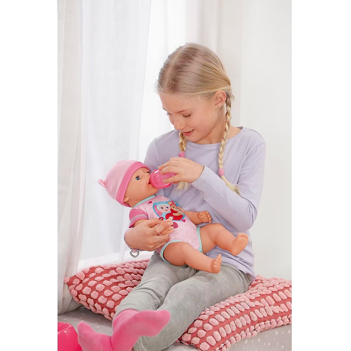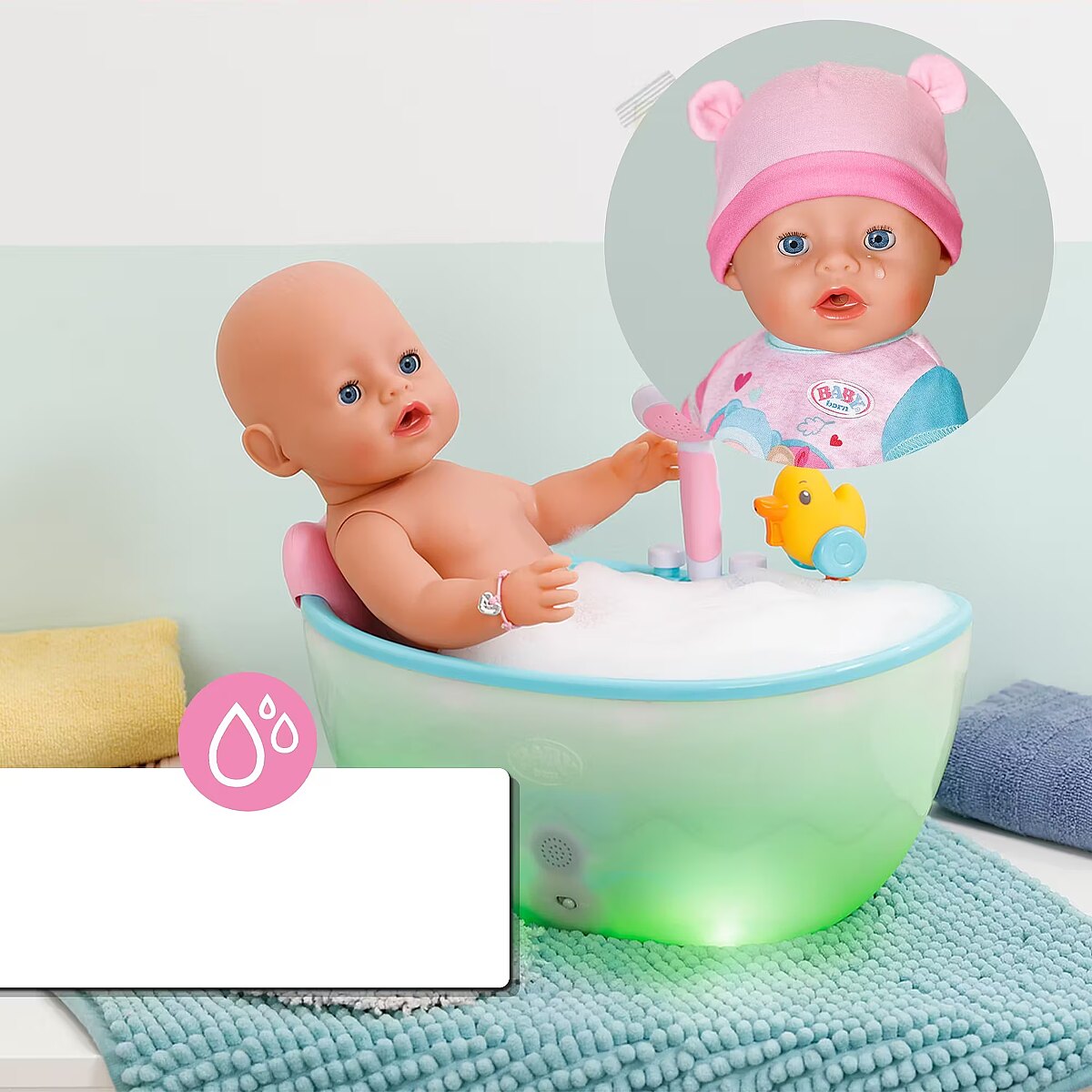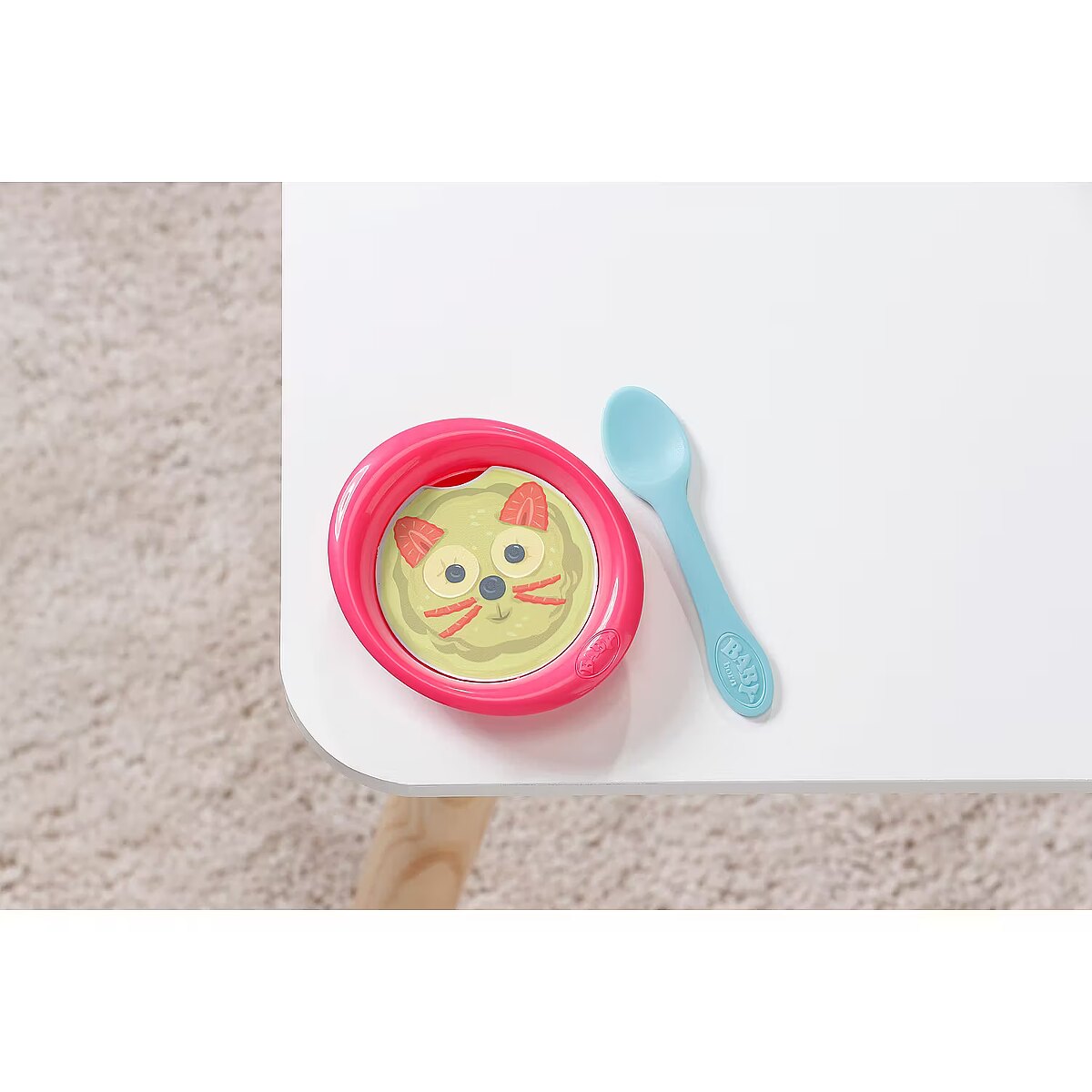 LongDesc - Here comes Emma! Already known from the BABY born animation series, which can be seen on YouTube and Toggo, Emma is now also available in her new outfit and with 10 accessories for you at home. She also has her magic plate with her: if you put water on the insert in the plate, the water magic makes delicious dishes appear, making the feeding game even more exciting. If you place her on her potty after playing with food (with water) or drink and press on her tummy, her small and large dishes will also appear there. If Emma drinks water from her bottle, she can even cry and needs to be gently comforted. The magic dummy helps here: if you turn it 180 degrees, her eyes close or open. Turn it again and the opposite happens. If you put her to sleep in her cot, she closes her eyes even without a dummy. But Emma can do even more: she is super manoeuvrable and can even be taken into the bath because she now dries even faster: to clean the doll properly after playtime, the leg can be removed to create a larger opening for cleaning. This makes it much easier for water to drain away. For even more creative play, in addition to her bottle, dummy, plate, spoon, meals and potty, Emma also comes with a nappy, her birth passport and two friendship bracelets - for a long and loving friendship between child and doll.In the usual BABY born quality that has been delighting generations of children since 1991.