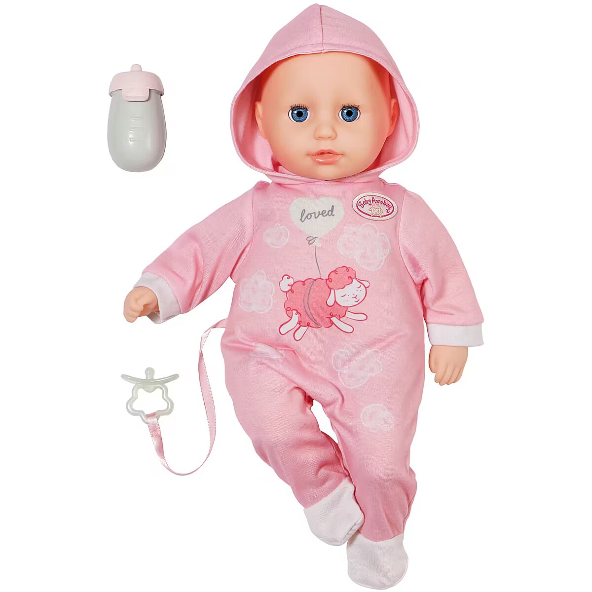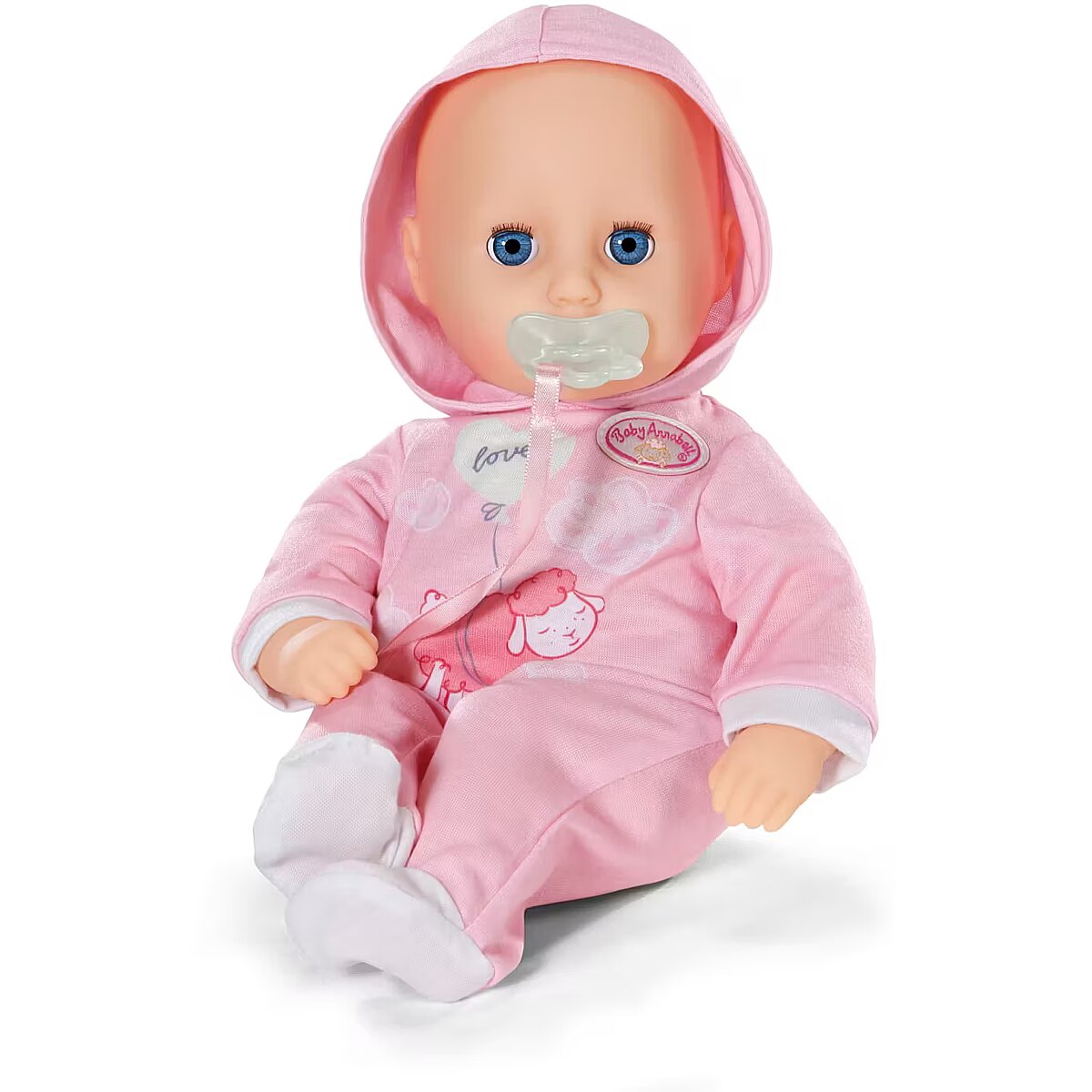 LongDesc - Baby Annabell Hannah Play with me is suitable for children aged 1 year and over thanks to her soft fabric body and 36cm height. Hannah's play principle is child's play. She reacts to every movement and interaction: If you hold her bottle to her mouth, she makes cute sucking noises, if you gently press her tummy, she announces with an "egg yes" that she feels good. If you tilt her to the left and right, she gives a little hiccup and a cheerful laugh. If you put Hannah to sleep after extensive play, she closes her eyes, breathes softly and finally falls asleep. She has her bottle, dummy and a casual hooded romper with her. Thanks to the easy handling, Hannah's small size and her simple play principle, even the youngest children can look after their baby doll.