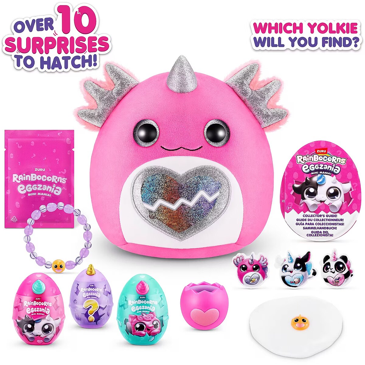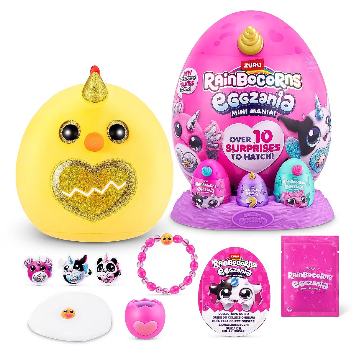 Packaging content - Packaging content - 1 x Eggzania Plush, 1 x Big Egg, 3 x Yolkie Eggs, 1 x Squishy Yolkie, 1 x Pack Rainbocorns Slime, 1 x Pack Beads, 1 x Length String, 3 x Stickers, 1 x Tag, 1 x Collectors Guide