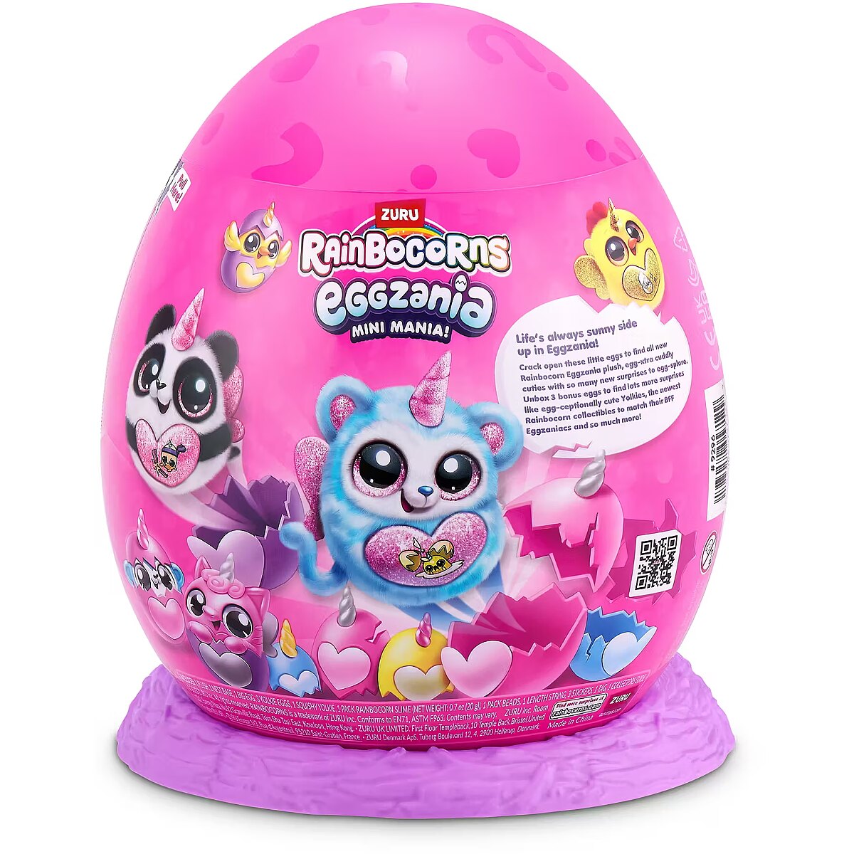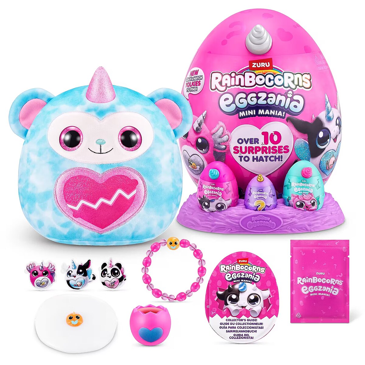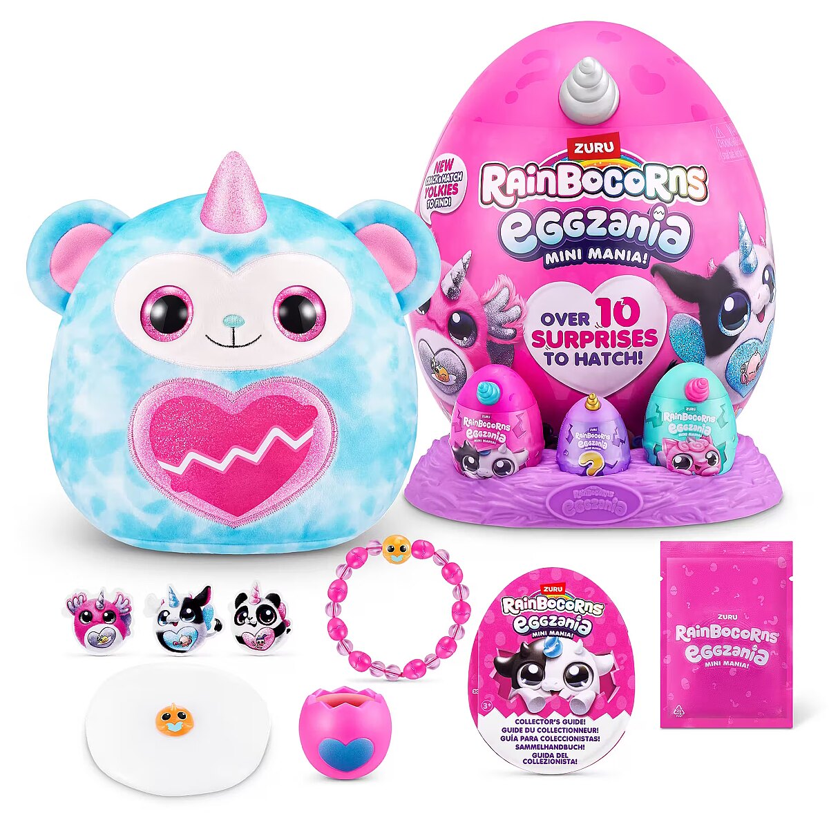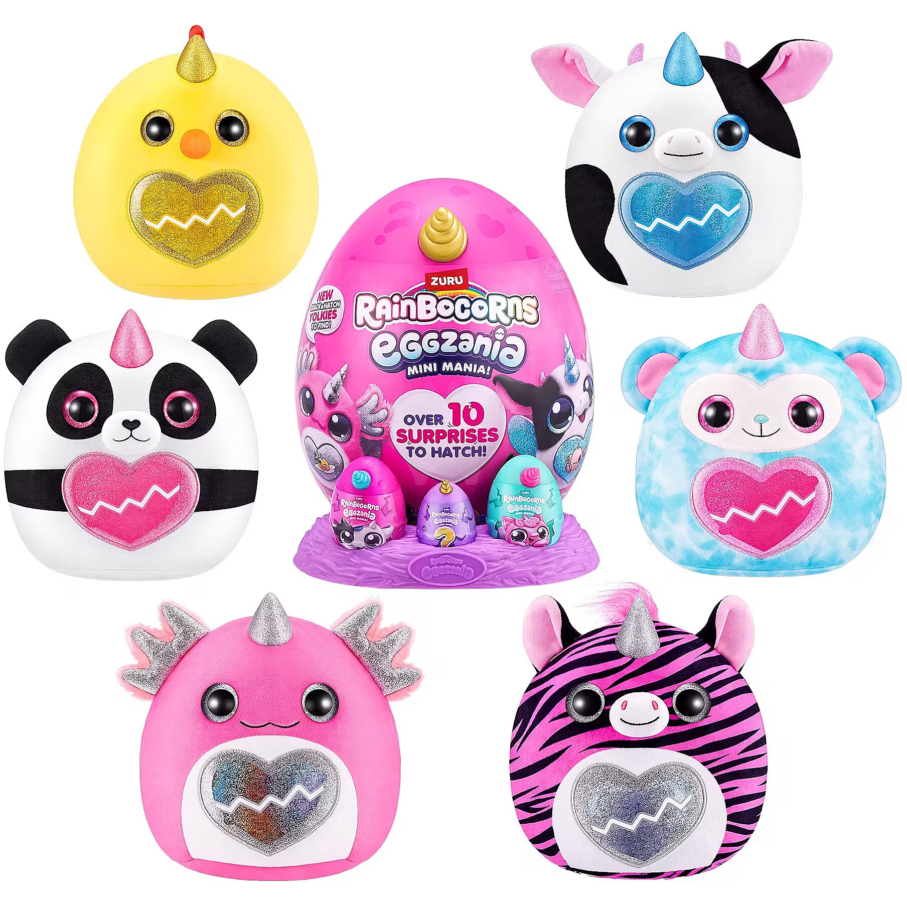 LongDesc - Rainbocorns Eggzania Mini Mania ZURUCrack into all-new Eggzania Mini Mania! This egg is oozing with over 10 surprises and brand new Eggzania characters! Remove the egg from the nest to hatch open your super-squishy Eggzania plush! There are 6 Eggzania animals to collect including an axolotl, cow and monkey. Each Eggzania plush comes with wearable Eggzania accessories, stickers, Rainbocorns slime and a Boo-boocorn!