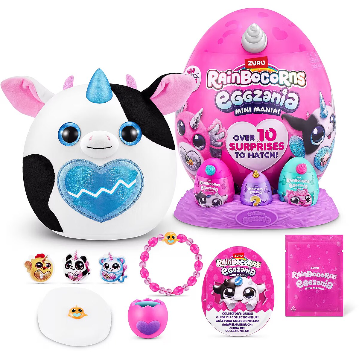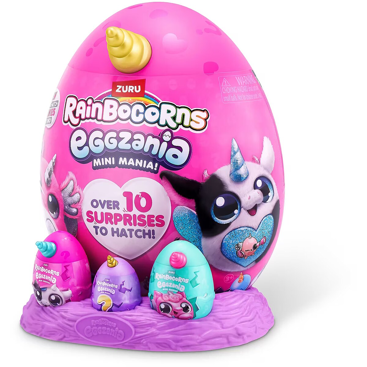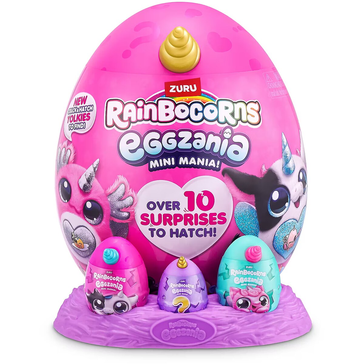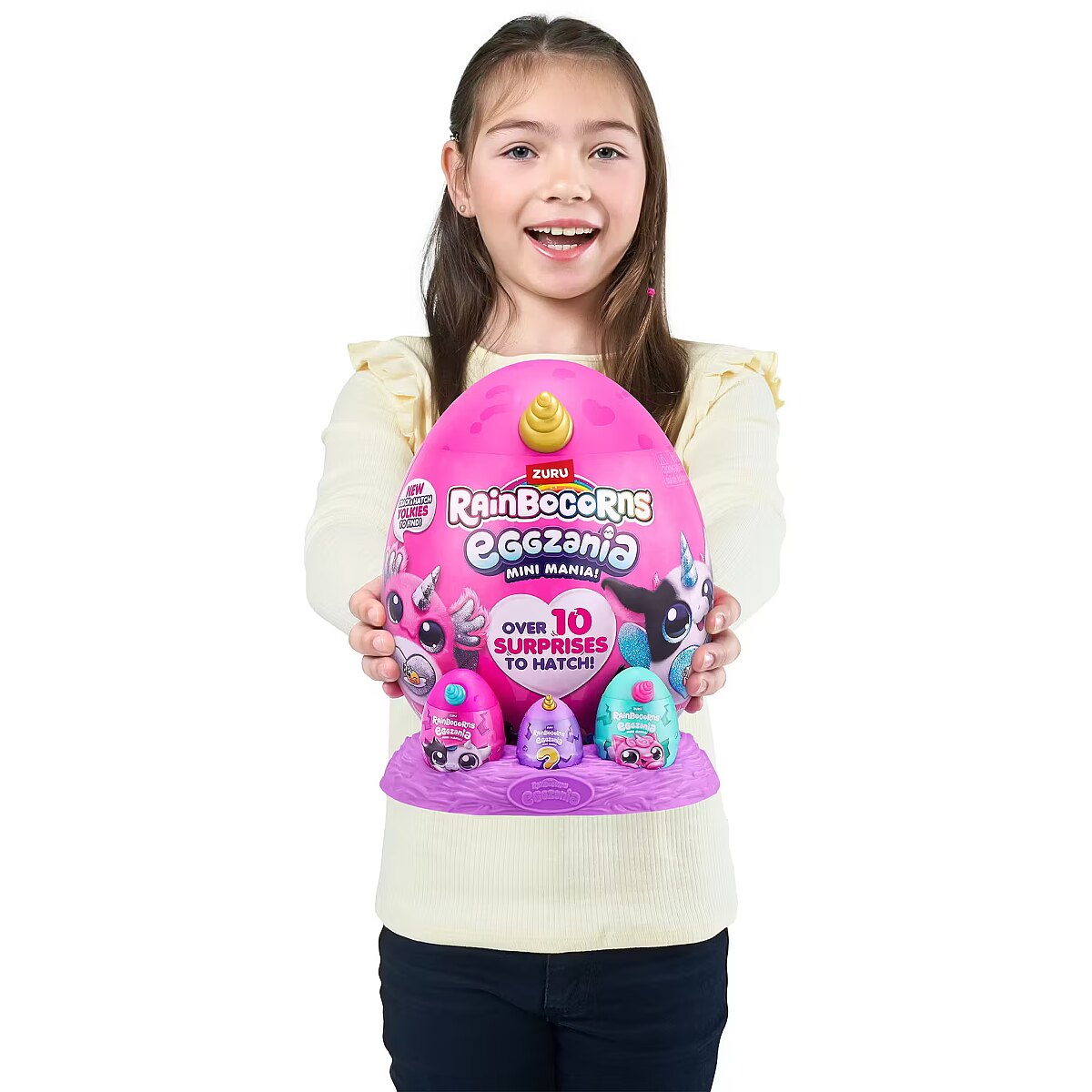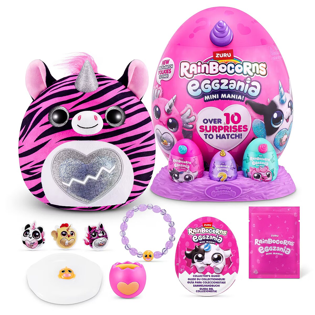 LongDesc - Rainbocorns Eggzania Mini Mania ZURUCrack into all-new Eggzania Mini Mania! This egg is oozing with over 10 surprises and brand new Eggzania characters! Remove the egg from the nest to hatch open your super-squishy Eggzania plush! There are 6 Eggzania animals to collect including an axolotl, cow and monkey. Each Eggzania plush comes with wearable Eggzania accessories, stickers, Rainbocorns slime and a Boo-boocorn!