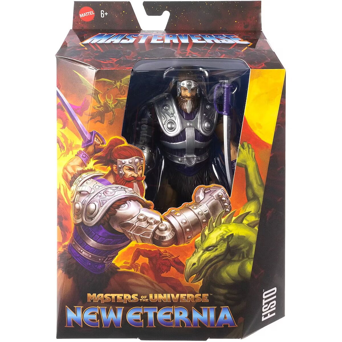 LongDesc - This Masters of the Universe New Eternia action figure of Fisto is designed at Masterverse 7-inch scale with 30 points of articulation. This collectable authentic design includes his signature iron fist and two heads one inspired by the original Alcala mini-comic illustrations and one with pony-tailed 'barbarian' look with face armor. This Fisto figure comes with removable metallic chest armor, a sword, swappable hand and metallic two-headed hammer with a round end and pointed end. This master of hand-to-hand combat comes beautifully packaged in a window box suitable for display. This New Eternia Fisto makes a great gift to start or build a MOTU collection. Colors and decorations may vary.