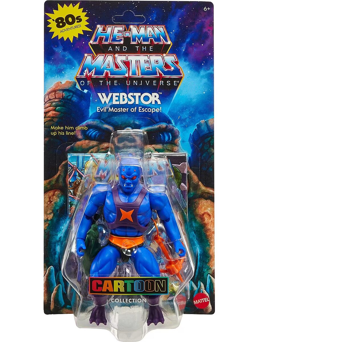 LongDesc - This MOTU Origins Webstor figure is inspired by the original cartoons from the '80s at 5.5-inch scale but with the modern posability provided by 16 articulated joints. This Masters of the Universe toy of the Evil Master of Escape can match poses from the 1980s content or make all new action moves. He has straighter legs and an overall more realistic build than his cartoon design. Webstor comes armed with a Grappling Hook and Grimalkin Statue. A mini comic is included to expand on his story. Makes a great gift for MOTU fans 6 years and older. Colours and decorations may vary.