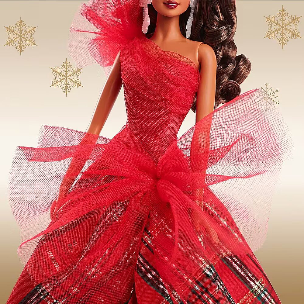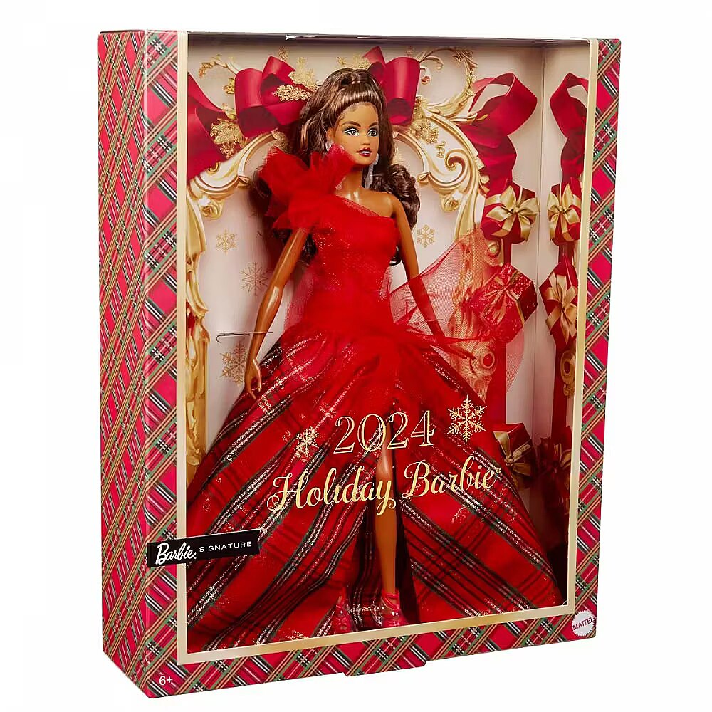 Description - Barbie Signature 2024 Barbie Holiday Doll The 2024 Barbie Holiday Doll embodies the warmth and love of the season with a festive gown for a glamorous celebration. Showcasing gorgeous drama, the dress pairs a draping, one-shoulder, sparkling red bodice with a full, plaid ballgown-style skirt. Big tulle accents offer a modern take on a classic look, while statement earrings add to the elegance. In packaging that's ideal for display, this collectible doll makes a great gift for anyone looking to build a collection or brighten up their seasonal decorations.