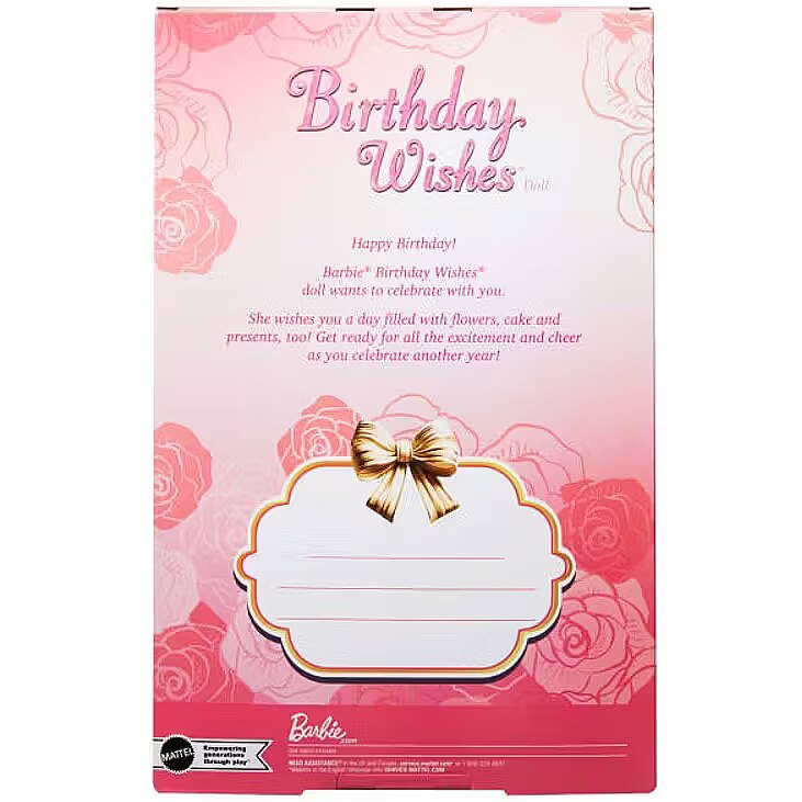 LongDesc - Barbie sends her warmest birthday wishes and wants to celebrate with you! This special occasion Barbie Birthday Wishes doll wears a satiny, pink underskirt, with a blooming print of flowers layered over her bodice. With a beautiful bow across her shoulders, Birthday Wishes Barbie makes a super sweet present for anyone's big day! The package offers a place to write a note, adding a personal touch that loved ones can cherish for years to come. May this Barbie doll be a good luck charm to help birthday wishes come true! Barbie doll cannot stand alone. Colours and decorations may vary.