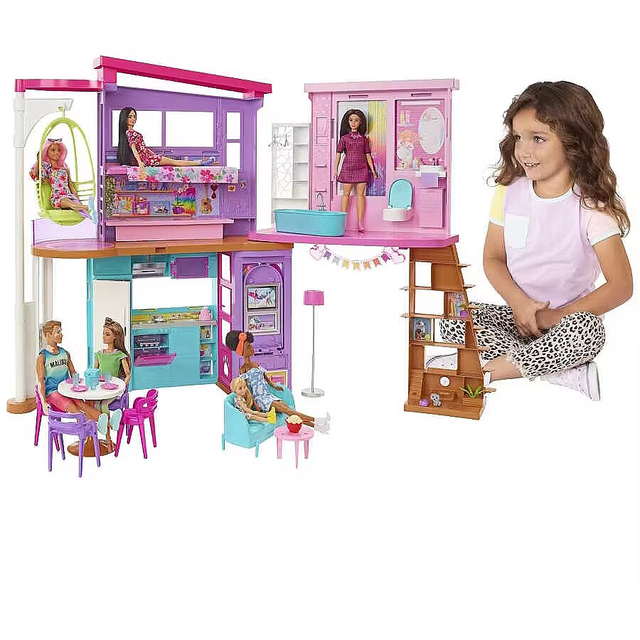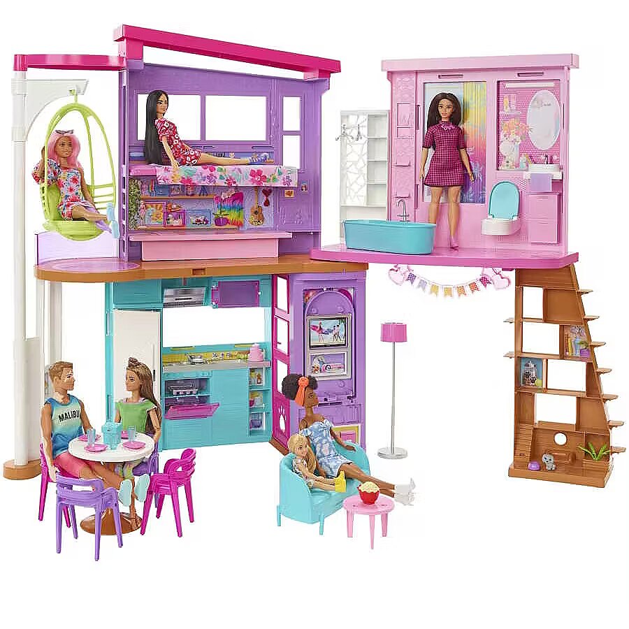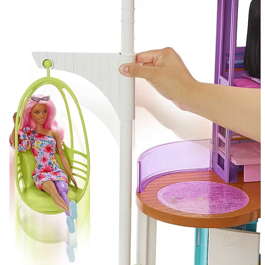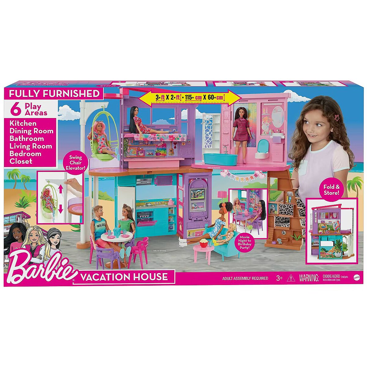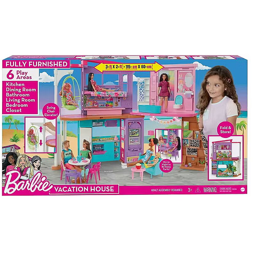 LongDesc - Kids can play out their dream vacations with the Barbie Vacation House playset! When imaginations step inside this 2-story Barbie dollhouse, they'll discover endless playtime possibilities with six play areas including a bedroom, bathroom, kitchen, dining room, living room and closet. This Barbie house opens the door to storytelling fun with a modern, stylish design and cool features, like a swinging chair that doubles as an elevator and a wall that flips up and down to set the scene for a movie night or a birthday party! With over 30 storytelling pieces, including a pet puppy, fun furniture and storytelling accessories, this Barbie Vacation House playset makes a great gift for kids ages 3 years old and up. Dolls sold separately. Colours and decorations may vary.