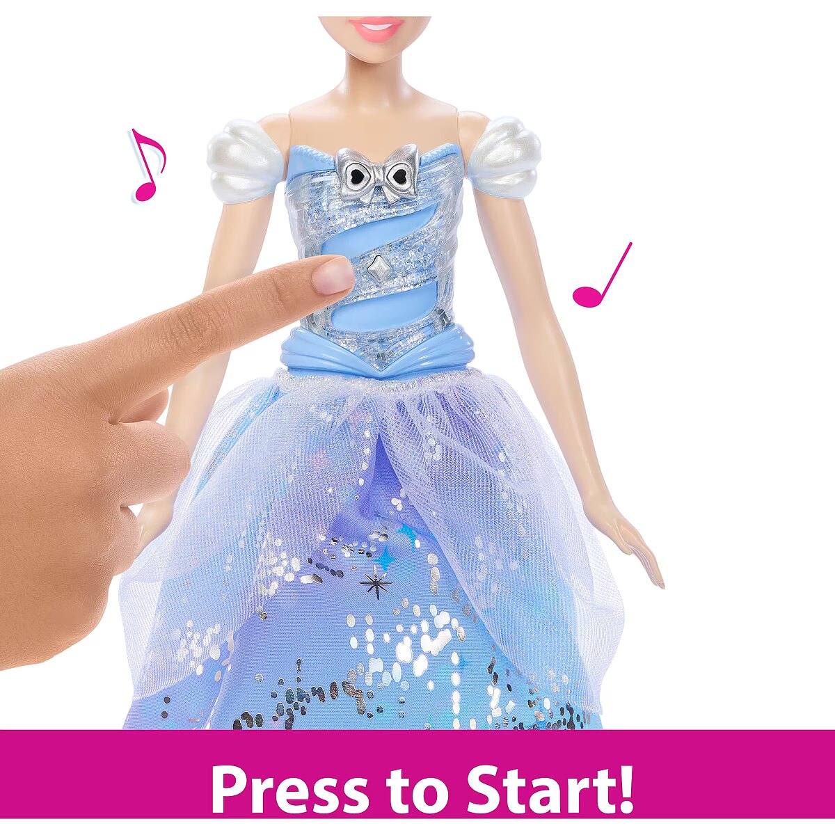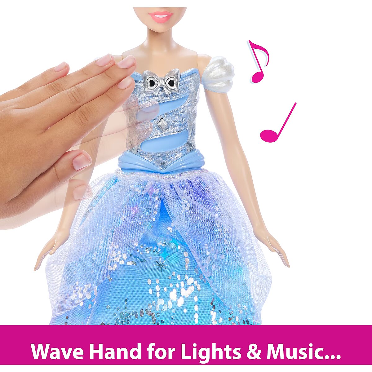 LongDesc - Enchanted Ballgown Disney Cinderella doll recalls the unforgettable Disney movie moment where a wave of a magic wand transforms Cinderella's dress in a swirl of sparkles! Kids can re-create the exciting moment at home by waving the included wand (or their hand) over the Cinderella fashion doll, activating a colourful light show complete with magical sound effects! No magic words required! Doll cannot stand alone. Colours and decorations may vary.