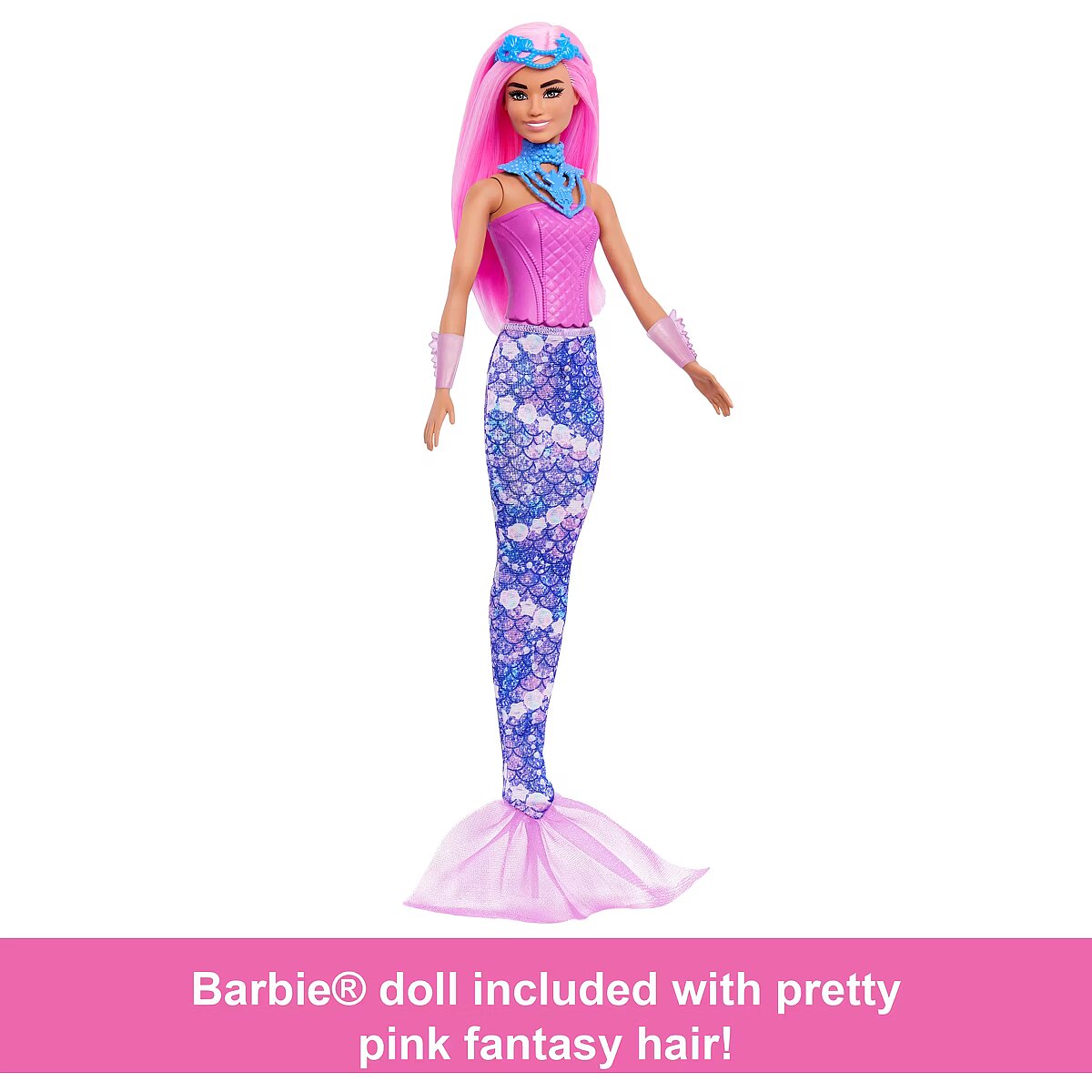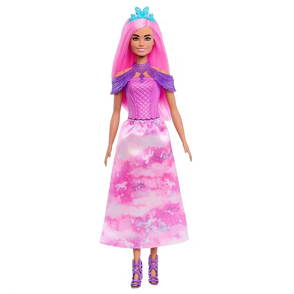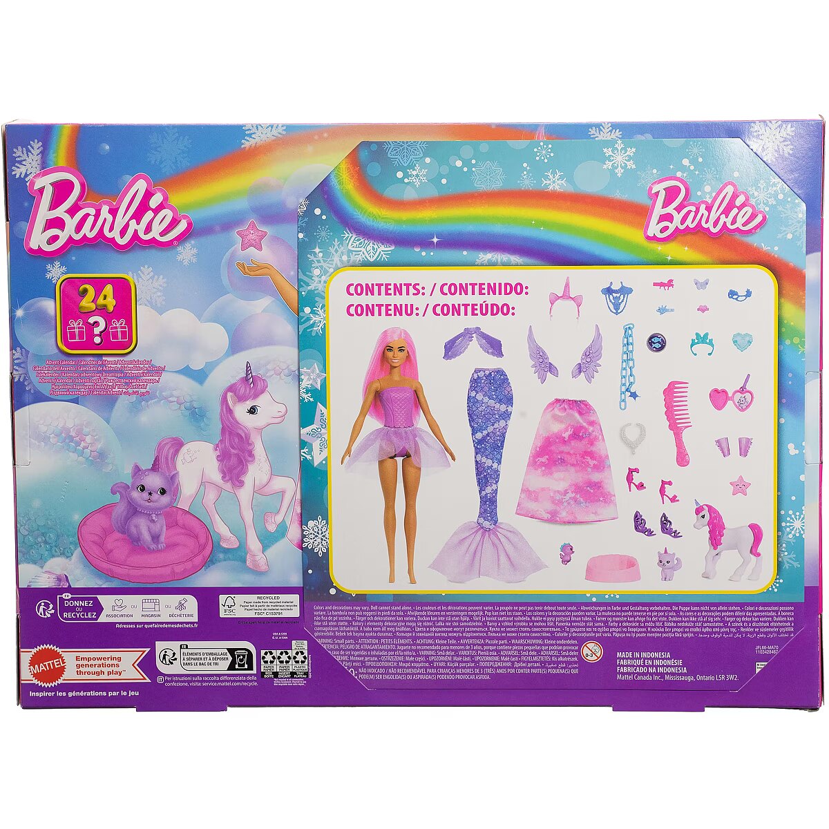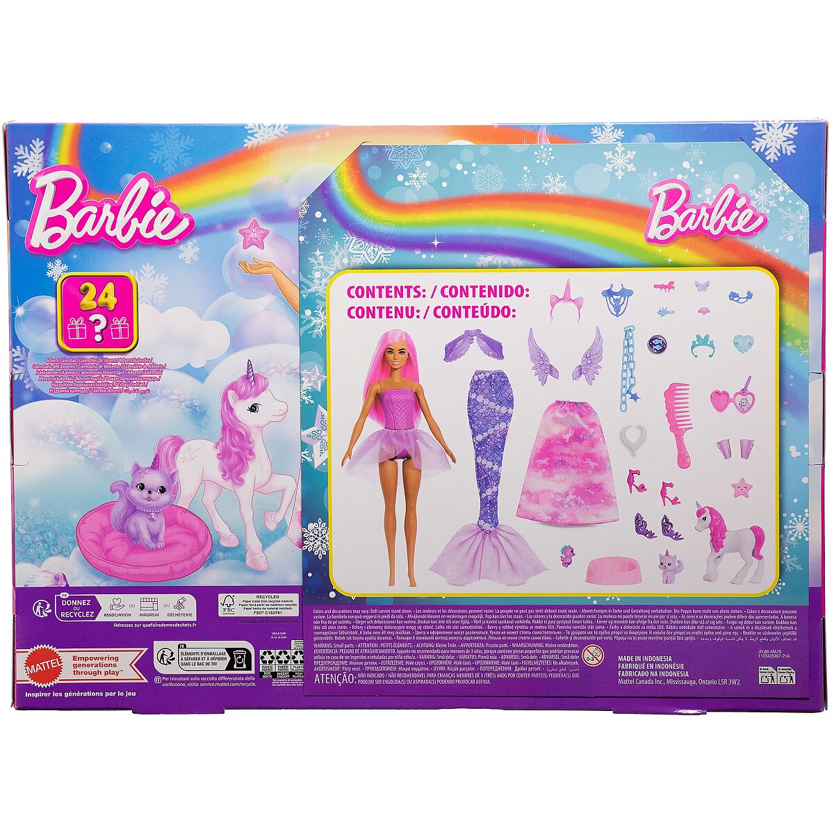 LongDesc - Count down the holidays with this Barbie Advent Calendar filled with fantasy-themed gifts! Open one surprise a day for 24 days (or all at once!) for a magical unboxing experience. Find a Barbie doll with pretty pink hair on the first day, and then clothes and accessories to transform her into a mermaid, royal, or fairy as more are revealed! The daily gifts include a mermaid tail, fairy wings, baby unicorn and other fantasy pet friends, dress-up headbands, and more. Kids can delight in a fantastical holiday with this Barbie Advent Calendar set! Doll cannot stand alone. Colours and decorations may vary.