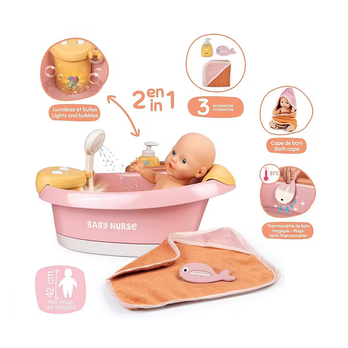 Description - Smoby Baby Nurse Balneo Bath All your favourite dolls will feel right at home in the Smoby Baby Nurse doll bathtub! While they take a nice, warm bath, bubbles rise to the top and a great light effect with different colours provides variety. After washing, they can be rinsed off quickly, as real water flows out of the automatic shower head at the touch of a button. The bath has an electronic module with 2 functions: Water jet with closed circuit and bubbles with light. The headrest ensures that your little one lies comfortably even during longer bathing sessions. The storage area offers enough space to store the accessories supplied: Cotton towelling bath towel, a shampoo bottle with pump function and a whale thermometer. The thermometer is heat-sensitive and changes colour when it comes into contact with water. Suitable for dolls up to 42 cm. Doll not included.