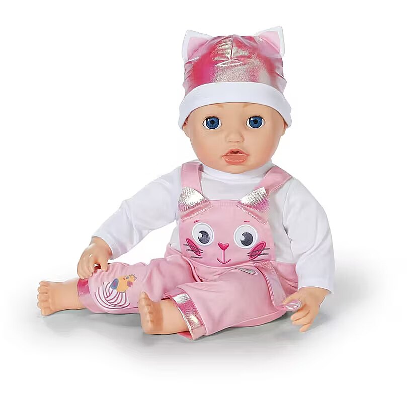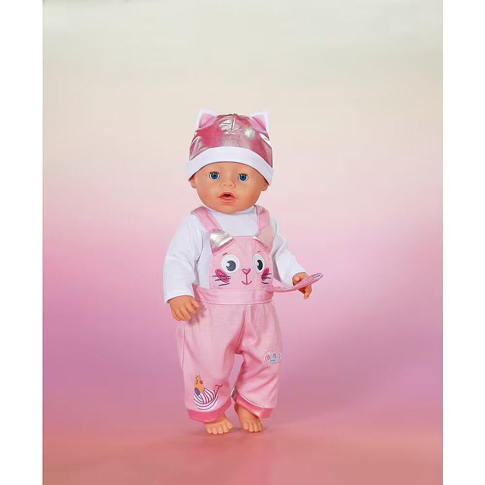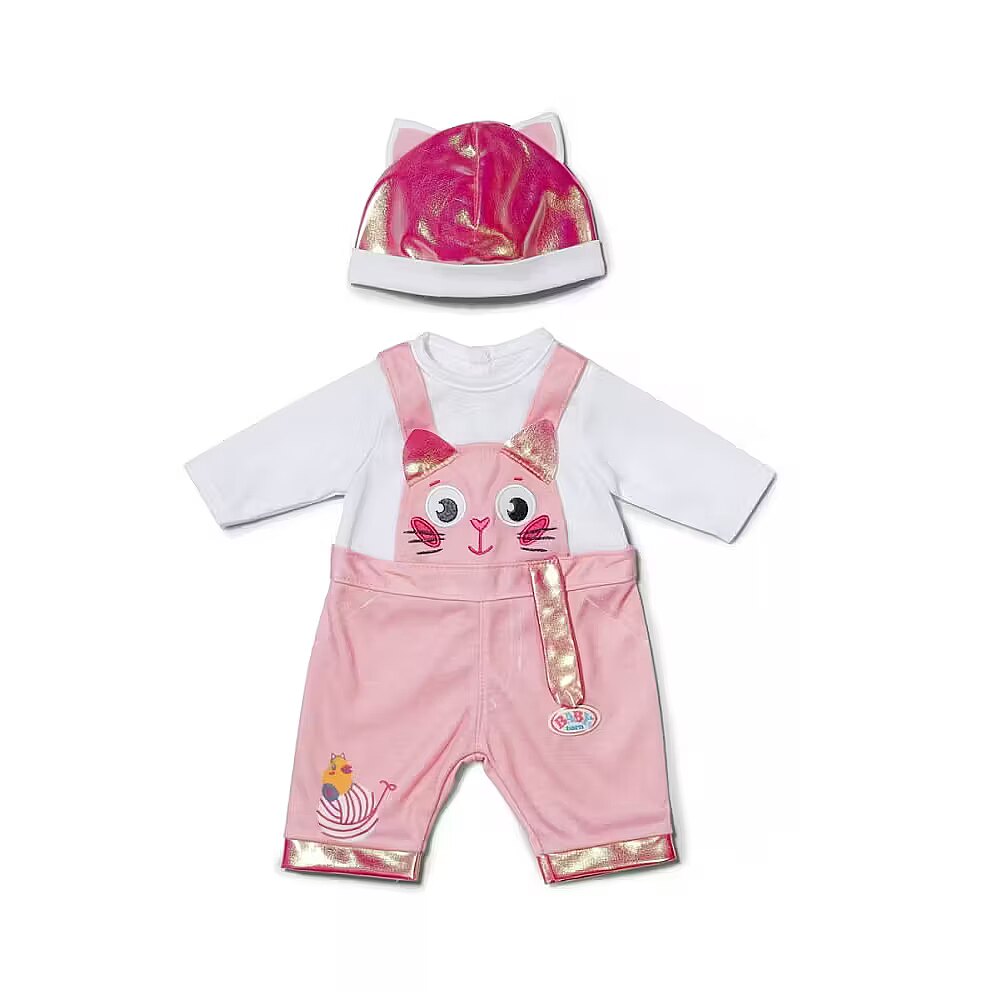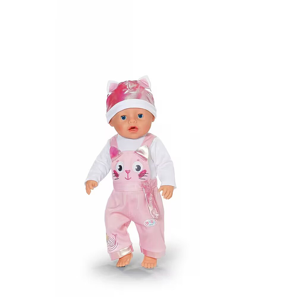 Description - BABY born Kitten Onesie - uroczy kombinezon w motywie kotka z długimi rękawami i spodniami ogrodniczkami, na których zabawnie biega kaczuszka Berta za kłębkiem włóczki. Do zestawu dołączona jest miękka czapeczka z małymi uszkami kotka, która dopełnia całą stylizację i czyni ją niezwykle uroczą. Strój pasuje do wszystkich lalek BABY born o wysokości 43cm oraz do pluszowego misia BABY born, zapewniając uniwersalność i wszechstronną zabawę. Zestaw jest zapakowany na wieszaku wykonanym z materiału pochodzącego z recyklingu, a jego wysoka jakość gwarantuje długotrwałą i kreatywną zabawę. Marka BABY born od 1991 roku zapewnia niezawodną jakość i radość z zabawy.