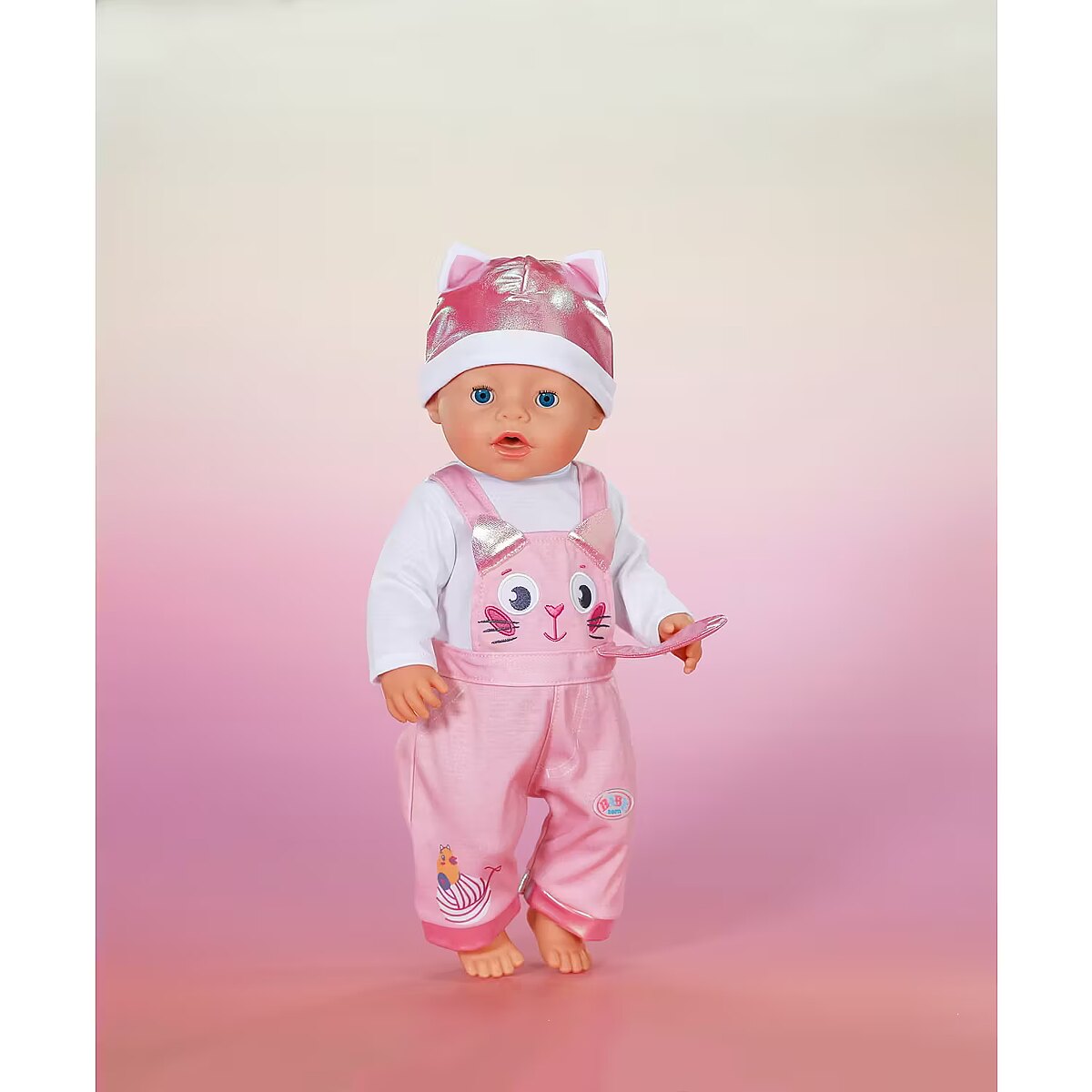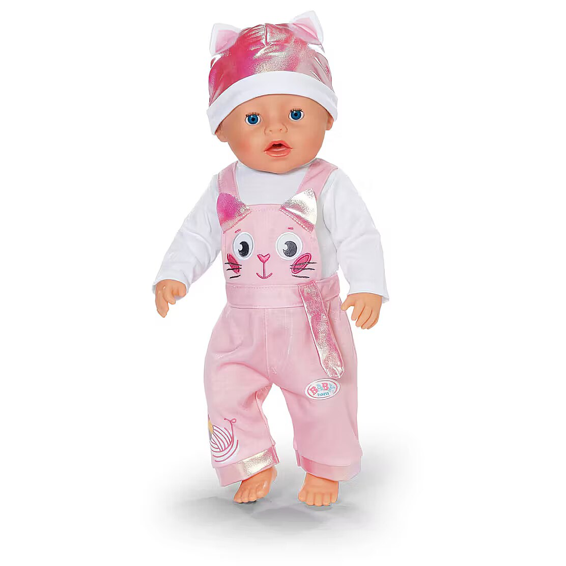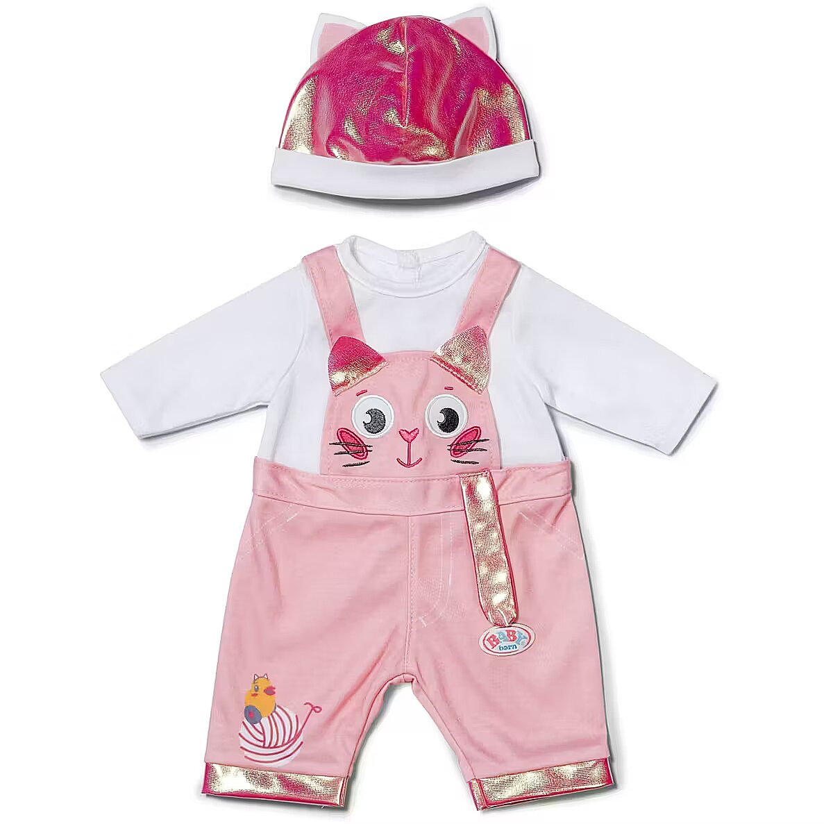 Description - BABY born Kitten Onesie - uroczy kombinezon w motywie kotka z długimi rękawami i spodniami ogrodniczkami, na których zabawnie biega kaczuszka Berta za kłębkiem włóczki. Do zestawu dołączona jest miękka czapeczka z małymi uszkami kotka, która dopełnia całą stylizację i czyni ją niezwykle uroczą. Strój pasuje do wszystkich lalek BABY born o wysokości 43cm oraz do pluszowego misia BABY born, zapewniając uniwersalność i wszechstronną zabawę. Zestaw jest zapakowany na wieszaku wykonanym z materiału pochodzącego z recyklingu, a jego wysoka jakość gwarantuje długotrwałą i kreatywną zabawę. Marka BABY born od 1991 roku zapewnia niezawodną jakość i radość z zabawy.