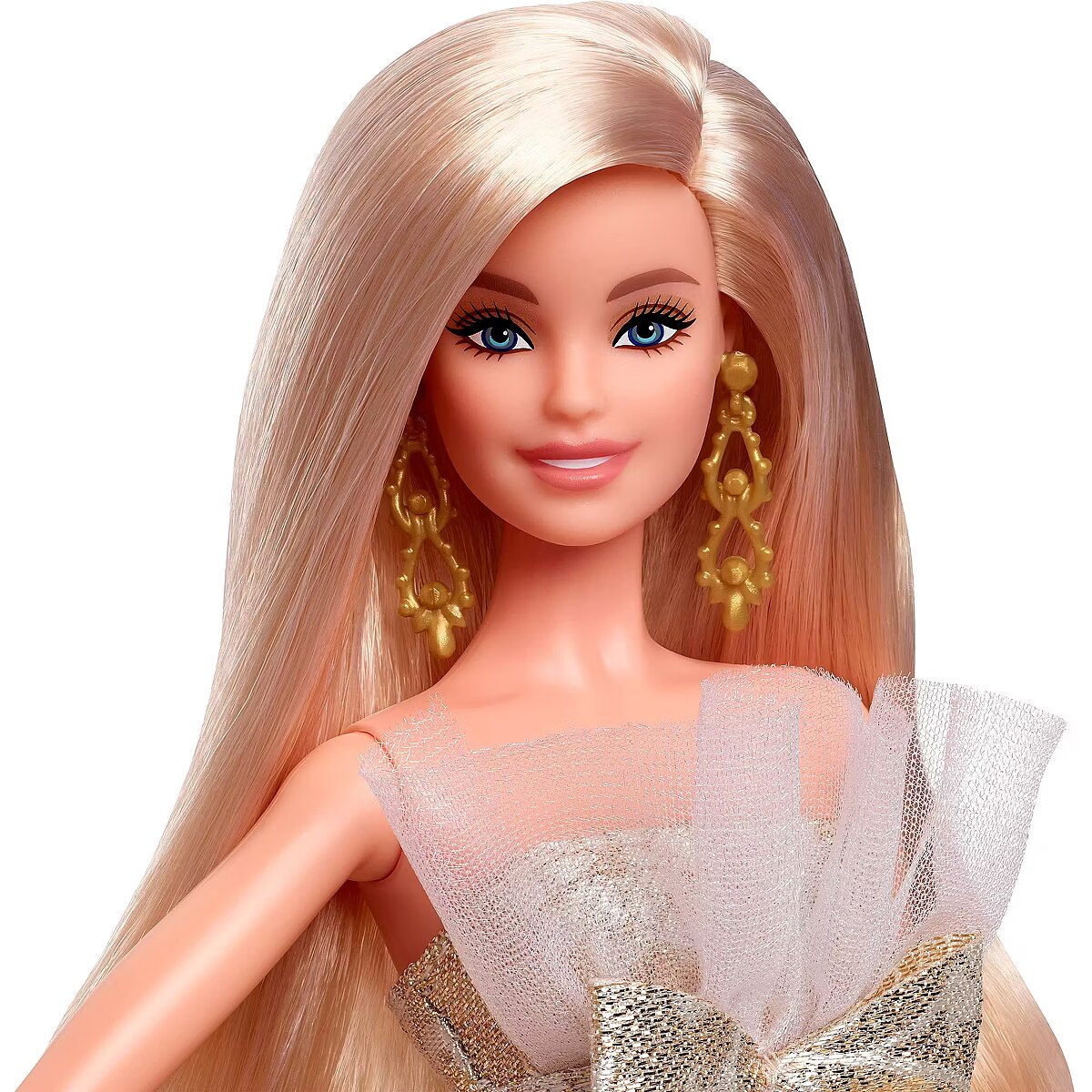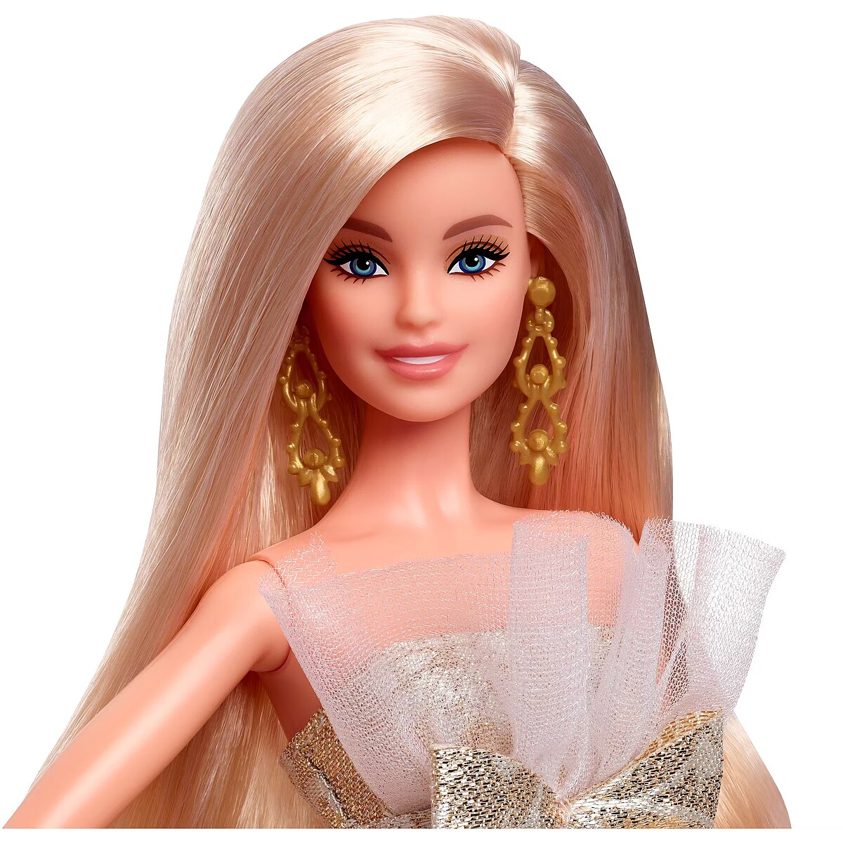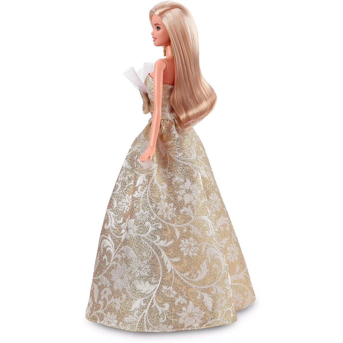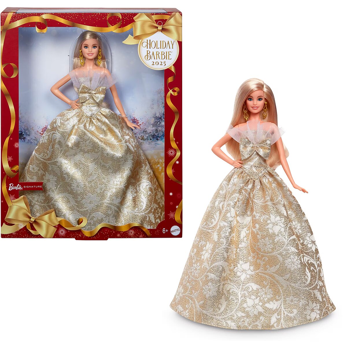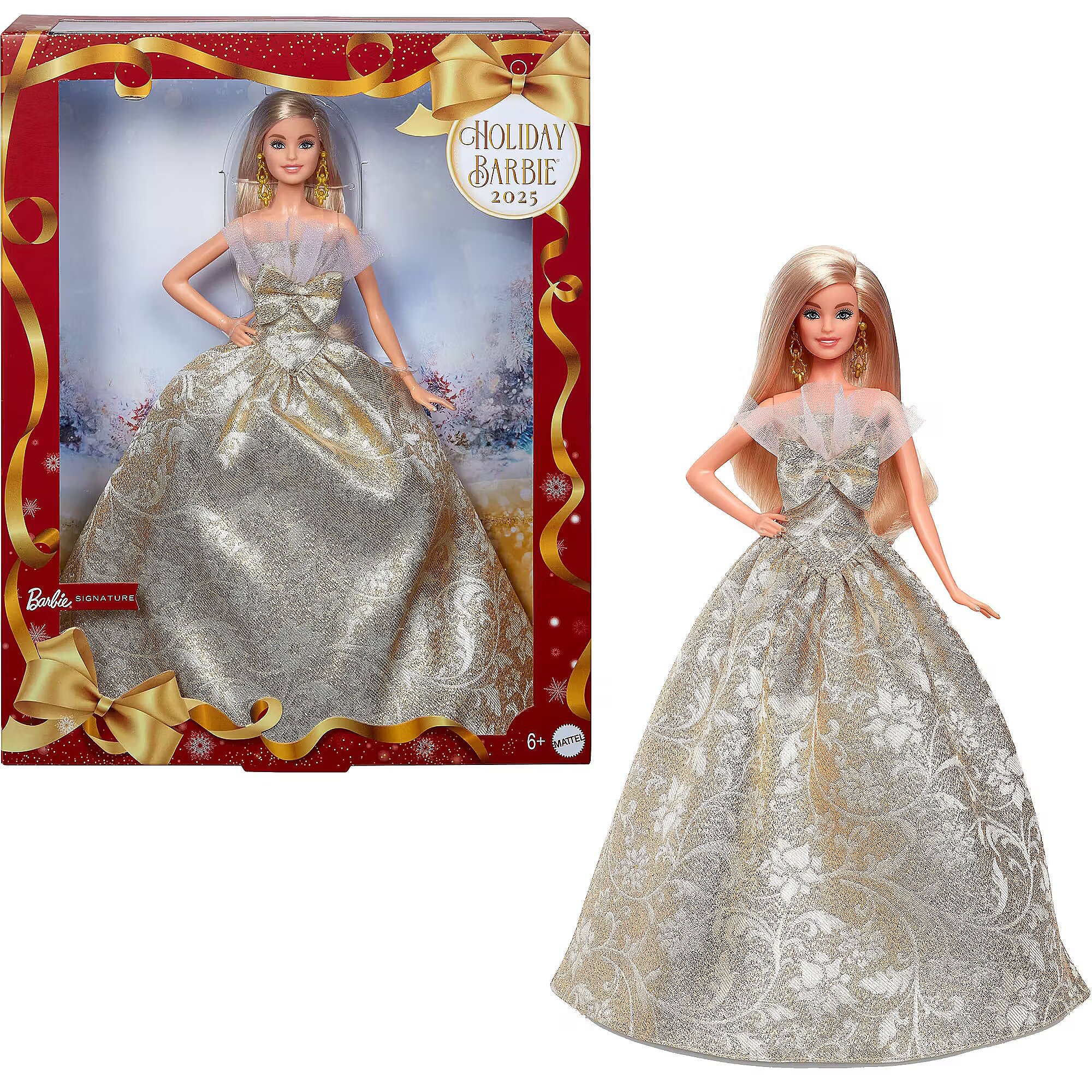 LongDesc - The 2025 Holiday Barbie doll shines like a star in and out of her packaging. Showcasing beautiful combinations of silver and gold damask print at the skirt, Barbie catches eyes in her gorgeous strapless gown, with a white, ruffle tulle trim at the collar. Barbie pairs her stunning gown with gold, drop earrings and pearlized gold heels. Her long beautiful, blonde hair and makeup complement her classic look. In packaging that's ideal for display, this collectible doll is for fans 6-year-olds and up. Includes doll stand and Certificate of Authenticity. Doll cannot stand alone. Colours and decorations may vary.