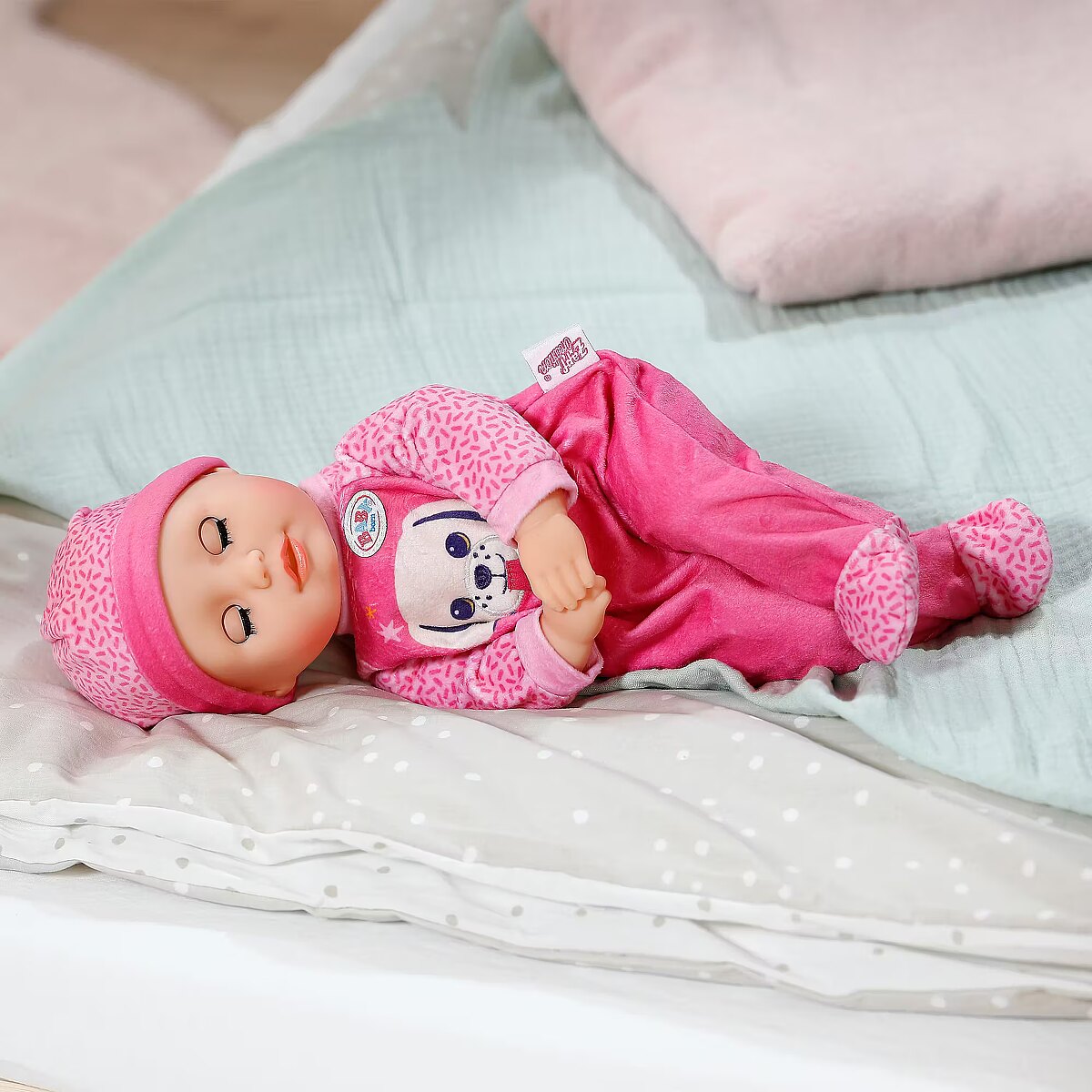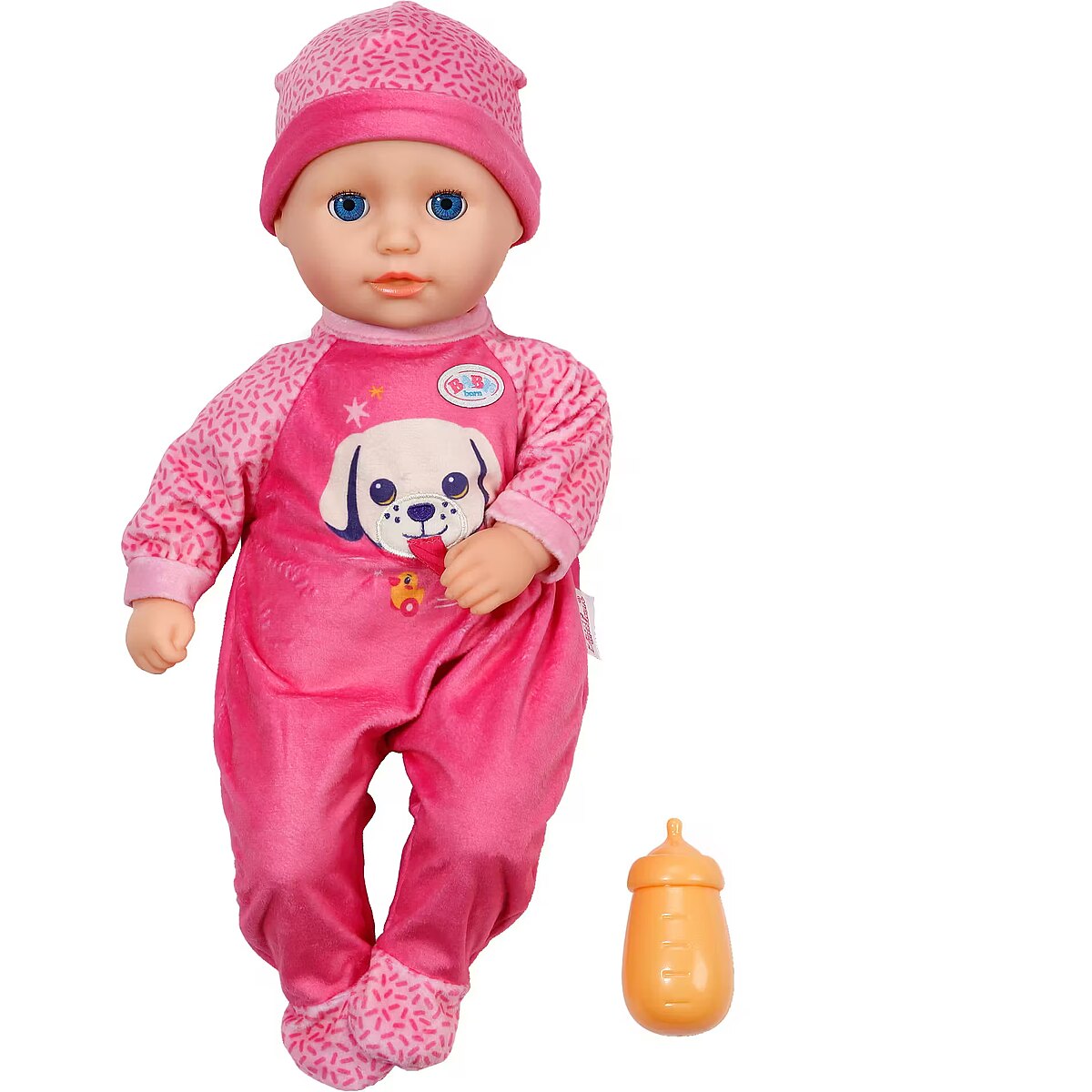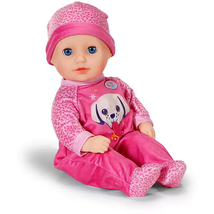 LongDesc - BABY born Anna invites you to cuddle with her soft fabric body and is the ideal first playmate for the little ones with her handy size. It feels particularly cuddly and provides security when playing and sleeping. If you lay her down for an afternoon nap after her bottle, her sleeping eyes close gently as if she were falling asleep peacefully.In addition to her bottle, Anna brings a pink romper decorated with a cheerful dog print. The cute details and the playful print make the outfit a real eye-catcher. A matching hat completes the look and makes Anna a perfect companion for every adventure and cuddle. Everything from BABY born in size 36cm fits her.