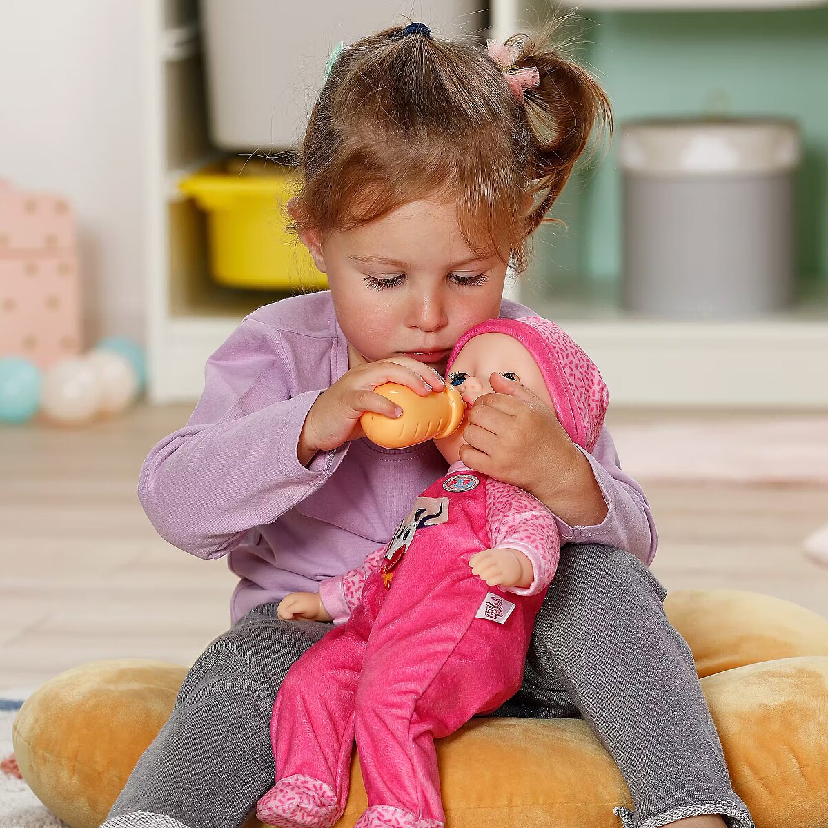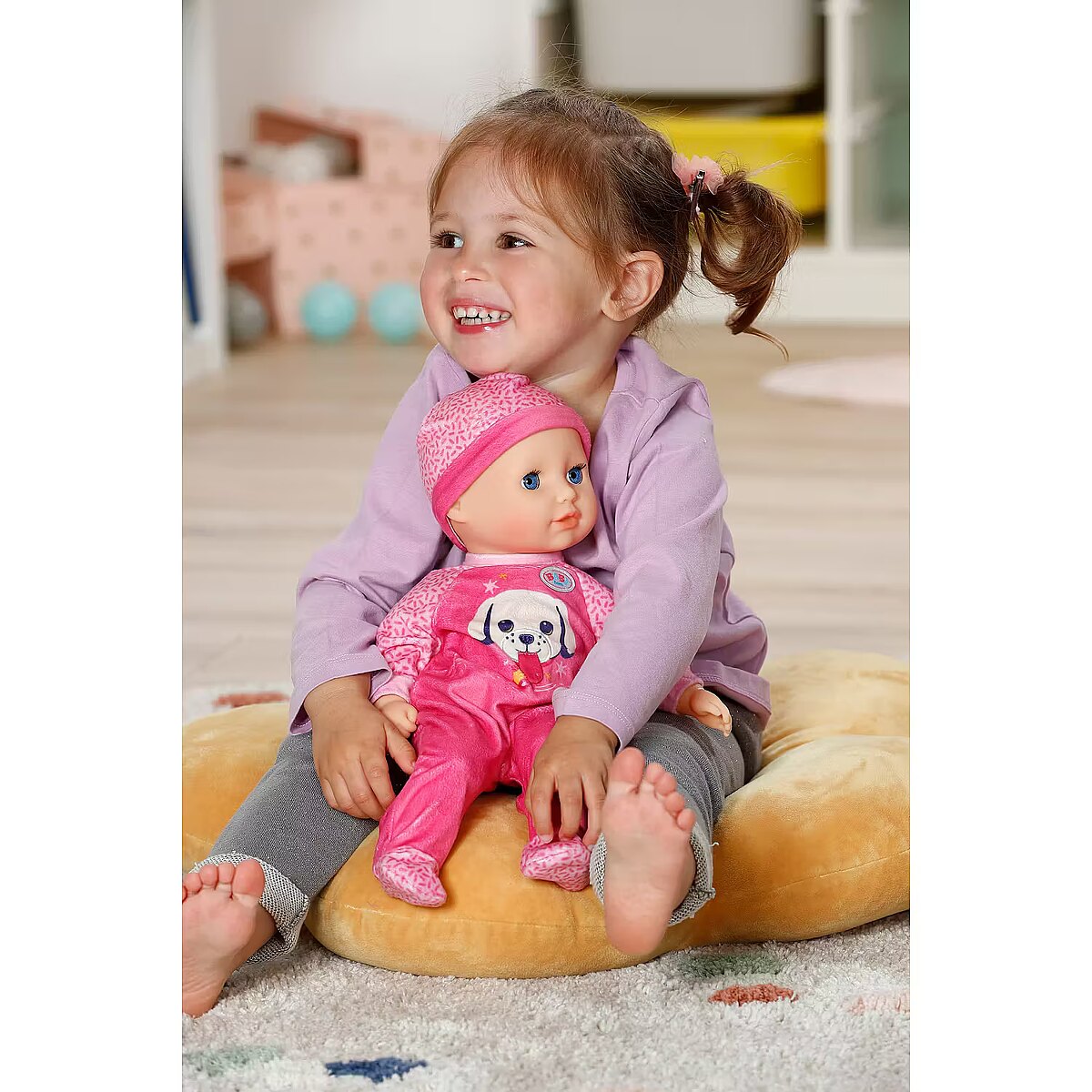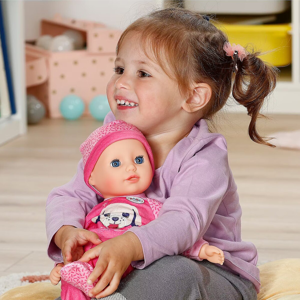 LongDesc - BABY born Anna invites you to cuddle with her soft fabric body and is the ideal first playmate for the little ones with her handy size. It feels particularly cuddly and provides security when playing and sleeping. If you lay her down for an afternoon nap after her bottle, her sleeping eyes close gently as if she were falling asleep peacefully.In addition to her bottle, Anna brings a pink romper decorated with a cheerful dog print. The cute details and the playful print make the outfit a real eye-catcher. A matching hat completes the look and makes Anna a perfect companion for every adventure and cuddle. Everything from BABY born in size 36cm fits her.