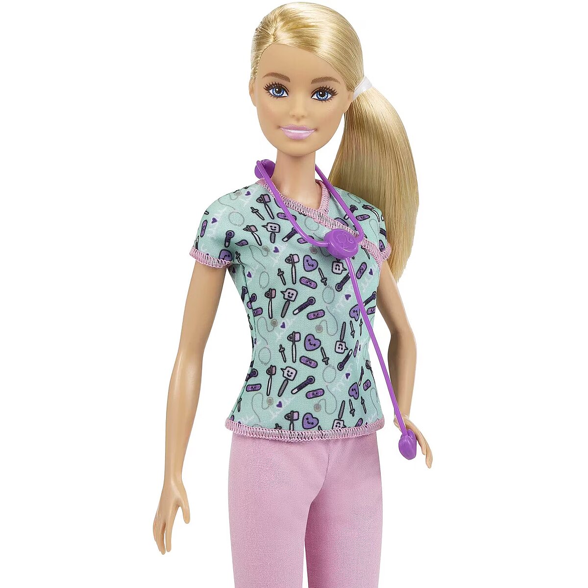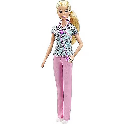 LongDesc - Kids can explore a whole new world of imaginative career fun with Barbie! This 12-inch Barbie Nurse Doll is geared up to take care of people, and kids can help Barbie tend to all her patients! She comes dressed in hospital scrubs, with a medical tool-print top, pink bottoms and white shoes, with her beautiful hair tied in a sleek ponytail. Doll accessories include a stethoscope, which adds to the storytelling possibilities that kids can enjoy with Barbie toys! Doll can’t stand alone. Colours and decorations may vary. Suitable for ages 3+.