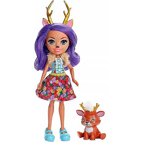 LongDesc - Let the adorable Enchantimals dolls and their animal friends enchant you. Danessa Deer doll shares a special bond with Sprint deer -- they're always together, and they look alike, too! A nurturer at heart, Danessa Deer doll (6-inch) wears a sweet outfit with lovely flower patterns and furry detail. Little ones will adore her long purple hair and enchanting details that match her animal-bestie, like a-doe-able antlers and deer ears. Sprint deer has charming touches, too, like matching antlers and a patch of furry white hair. Kids will love playing out the special bond these two friends share and creating their own Enchantimals adventures! Collect them all to build out your whimsical world of Enchantimals (each sold separately, subject to availability). Includes doll wearing fashion and accessories and animal figure. Colours and decorations may vary.