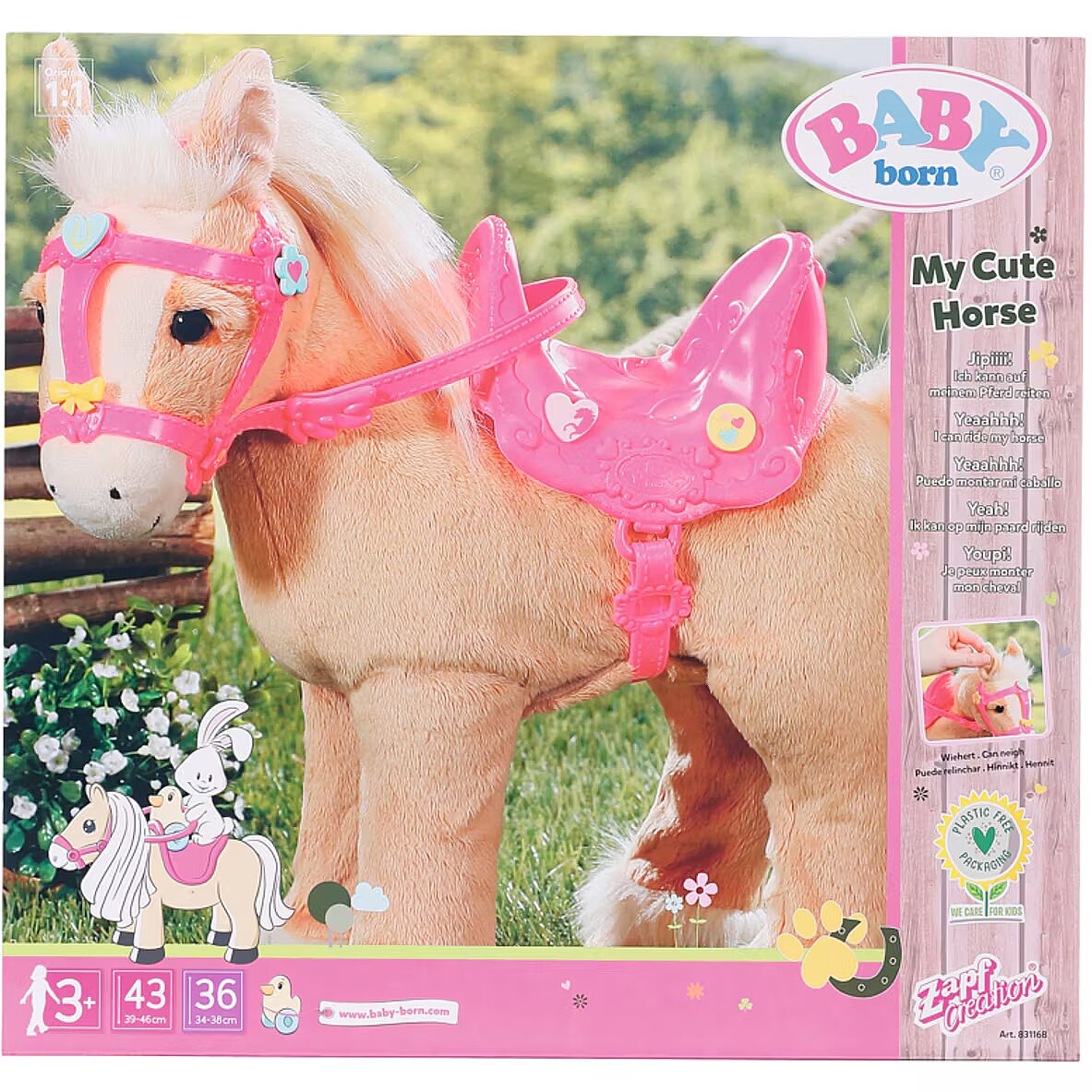 Technical_details - BABY born® My Cute Horse, cuddly toy When BABY born is in the pit lane and takes the pins out of the horse box, a horse show is definitely on the agenda. Then she always trims her sweet pony in a particularly pretty way. The pink saddle and the pink bridle are decorated with colorful pins and the white mane and white tail are extensively coiffed. The cute little horse already knows exactly what's going on and whinnies excitedly. It does when its right ear is pressed. By pressing the left ear, the horse starts to move. It prefers to run on flat surfaces. The sound of hoofbeats and happy horse noises can be heard. Another pressure on the left ear stops the riding excursion. Type: stuffed animal EAN code: 4001167831168 Manufacturer number: 831168 Series: BABY born® Contents/Equipment: BABY born My Cute Horse with saddle, bridle and pins Age recommendation: from 36 months Target group: kindergarten children Material: fabric audio: yes Warnings: Caution: Not suitable for children under 36 months! Warnings: Attention: Danger of suffocation due to small parts! Accessories: required | 4 AA batteries