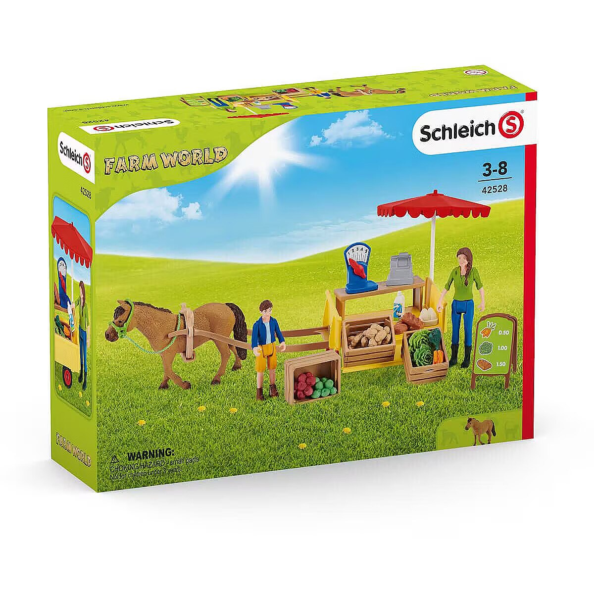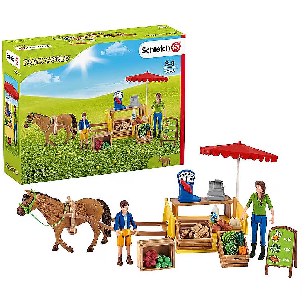 LongDesc - With the Sunny Day Mobile Farm Stand from schleich® FARM WORLD, Ben and his mother Laura can present and sell their fresh produce!FW Ben and his mother Laura load the Sunny Day Mobile Farm Stand from schleich® FARM WORLD with fresh produce directly from their farm. Juicy apples, freshly laid eggs, crisp lettuce, potatoes from the field, chilled milk and crusty bread all fit on their wagon. Once everything is loaded, they hitch up their hard-working pony Poppy to the wagon and head off to sell their produce. Do they have enough apples with them?The produce can be arranged as needed on the farm stand and the pointer on the scale can be moved. The set offers a variety of play options and perfectly supplements FW 42407 Large Farm House.