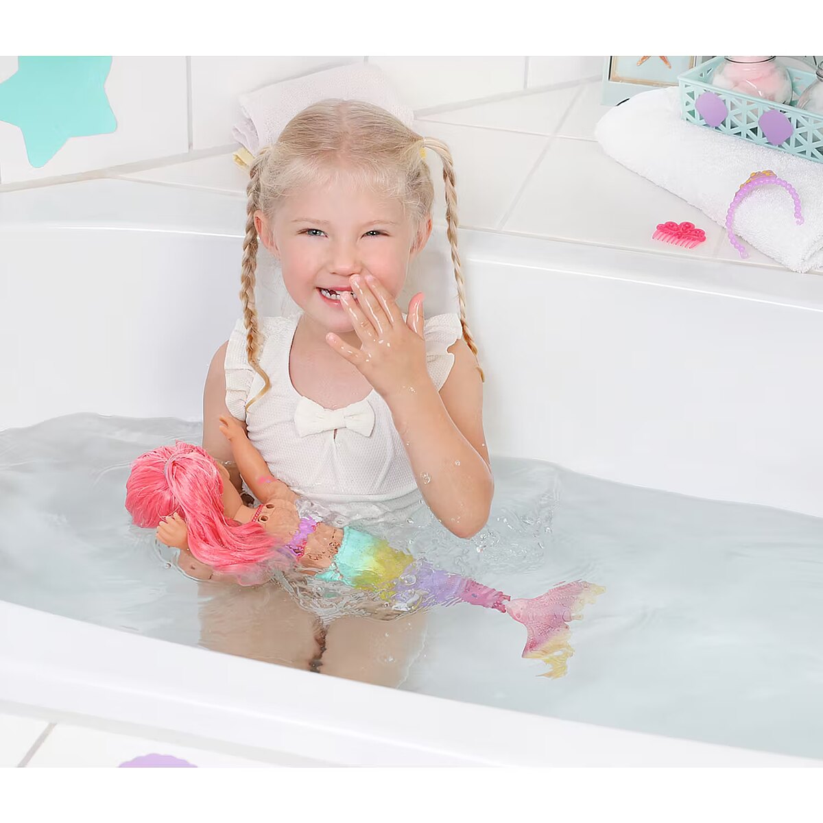 Technical_details - BABY born® Little Sister Mermaid 46cm, doll When you think of the sea, you immediately think of the color blue. That's right, the water is blue, but the waves are pretty colourful. The little BABY born mermaid is the best example of the colorful underwater creatures. Her fishtail is very colorful and decorated with glitter elements. It moves when it comes into contact with water. The top in shell design and the colorful body painting goes perfectly with the mermaid tail. The mermaid wears a purple tiara in her long pink hair. The hair can be styled with the comb again and again into new hairstyles. Type: doll EAN: 4001167833681 Manufacturer No.: 833681 Series: BABY born® Age recommendation: from 36 months Target group: kindergarten children Warnings: Caution: Not suitable for children under 36 months! Warnings: Attention: Danger of suffocation due to small parts! Accessories: required | batteries Dimension: Height: 460 mm