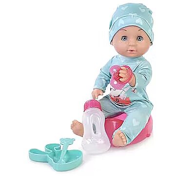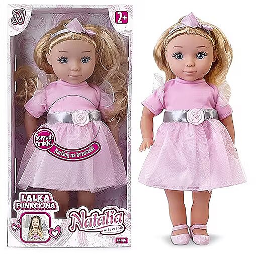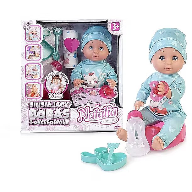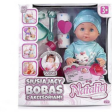 Description - 30cm peeing baby doll (pyjamas with cat). The set includes a nappy, spoon, bottle, dummy, potty, bunny-shaped plate. The toy allows you to change the baby's nappy, give him a dummy, drink him, feed him and place him on the potty. The extras feature embossing to make the product more realistic. The doll is dressed in adorable pyjamas. There is a cap on her head. The babe closes her eyes when she lays it down. Everything is packaged in a box with a window. An interesting addition is a special card on which we can write the name, height, weight and date of birth.