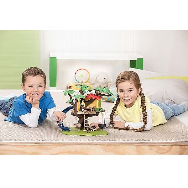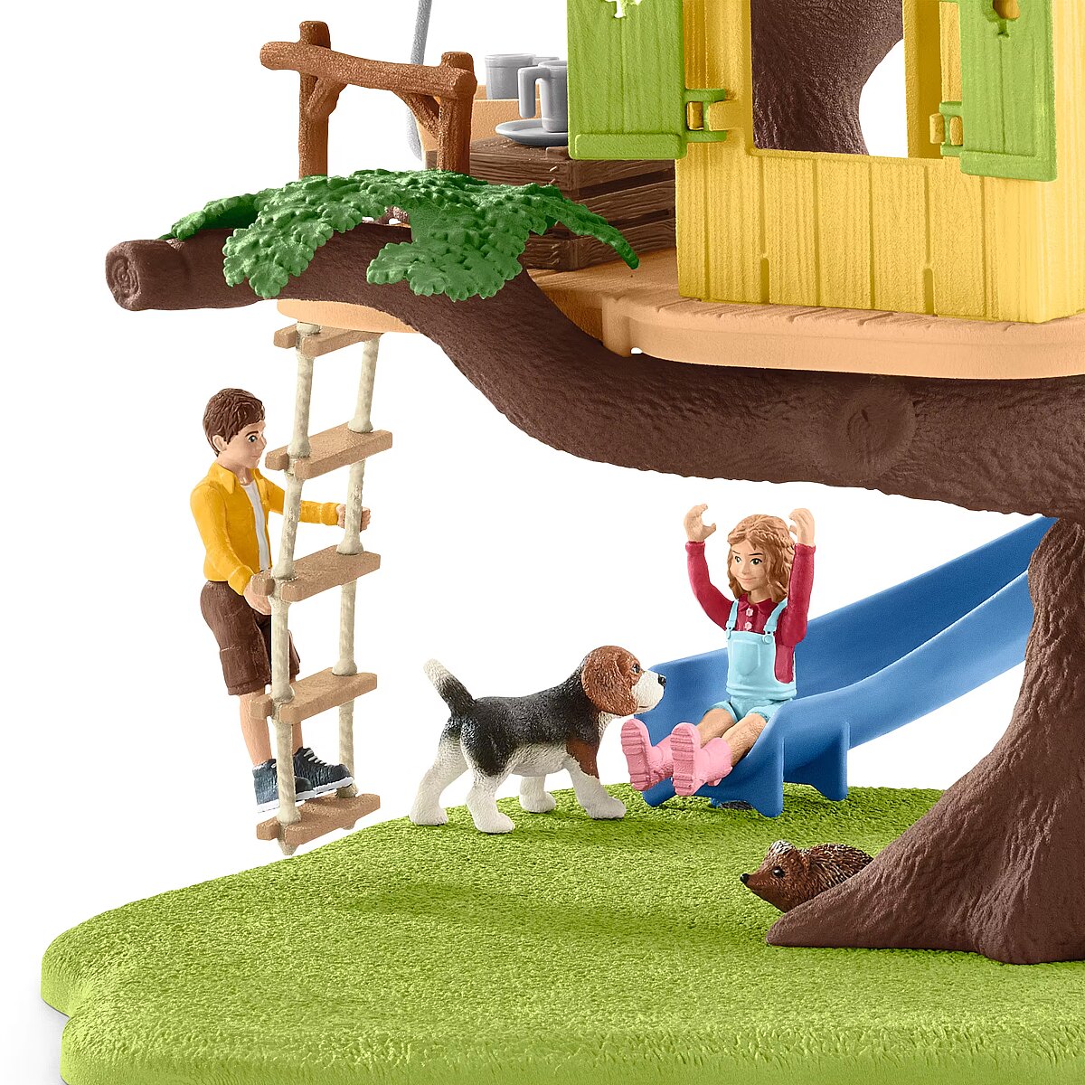 LongDesc - Ben and Sarah can lark about, play and picnic for hours in the schleich® tree house. Who hasn't dreamt of having their own tree house?The set contains a whole host of accessories and functions for hours of fun. With 2 human figurines, 4 animals and accessories. The schleich® figurines are exceptionally detailed, lovingly painted and allow children to play and learn at the same time.The two farmer family children, Ben and Sarah, can lark about, play and picnic for hours in the schleich® tree house. Who hasn't dreamt of having their own tree house? The set includes lots of functions for hours of fun.While Ben watches the animals from the viewing platform, Sarah slides down the slide. The puppy is already waiting for her. Sarah can climb back up the ladder into the tree house. The cute Beagle puppy can easily be brought up into the cosy tree house using the pulley. They can then all play together. The hedgehog also has his own home in the hollow in the trunk, and the little bird loves his little domain in the leaves.With 2 human figurines, 4 animals and great accessories. The set is the ideal addition to the 42407 large farm, which is available separately.The schleich® figurines are exceptionally detailed, lovingly painted and allow children to play and learn at the same time.