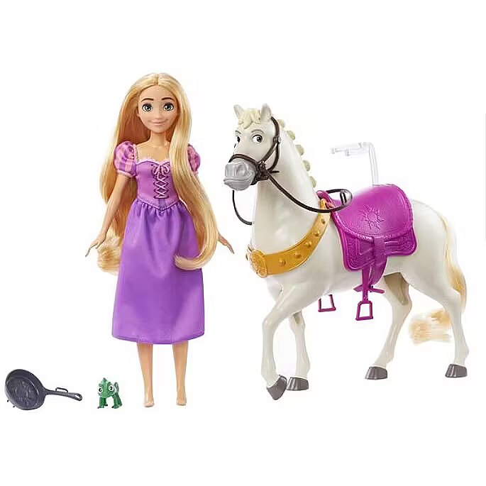 LongDesc - This Rapunzel doll, inspired by the vibrant and creative princess from Disney's Tangled, is ready for adventure with her devoted horse Maximus! With a saddle and bridle for Maximus, and bendable knees on Rapunzel doll, the two are ready to ride around the kingdom together. Pascal figure can be clipped onto Maximus's mane or Rapunzel's arm and join in the fun, too. Doll cannot stand alone. Colours and decorations may vary.