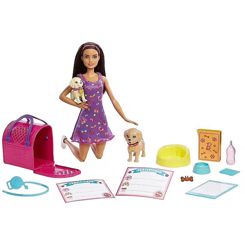 Packaging content - Packaging content - Includes 1 Barbie doll wearing dress and shoes, 1 colour-change puppy and 1 drinking/peeing puppy each with collar and dog tag, 1 colour-change pee pad, 1 pet carrier, 1 pet bed, 1 food bowl, 1 bottle, 1 bag of food, 1 treat, 1 towel, 1 dog toy, 1 leash and 2 adoption certificates. Doll cannot stand alone. Colours and decorations may vary.