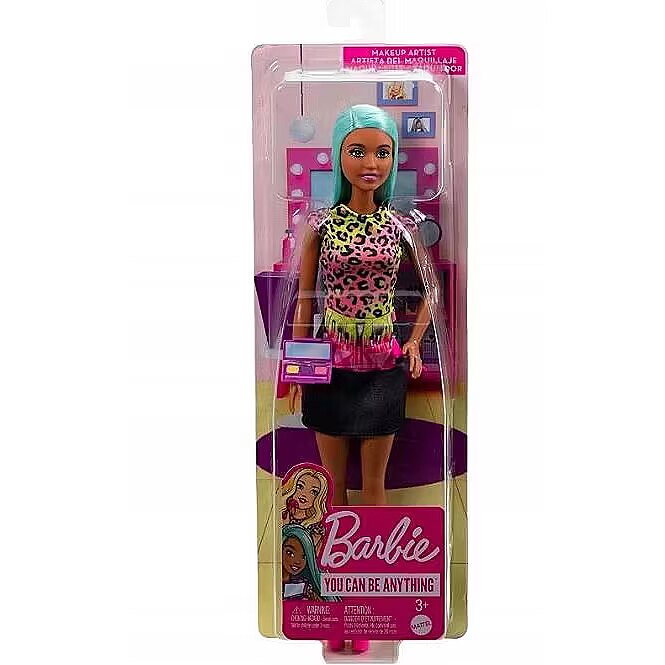 LongSummaryDescription - Barbie Makeup Artist Doll with Teal Hair and Career-Themed Accessories Like Palette and Brush. Doll type: Fashion doll, Doll's gender: Female, Recommended age (min): 3 yr(s), Suggested gender: Boy/Girl. Height: 290 mm, Weight: 120 g. Material: Fabric, Plastic, Product colour: Multicolour