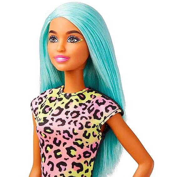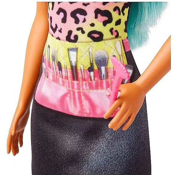 LongDesc - Makeup Artist Barbie doll is ready to give clients a new look with a print-on styling apron and makeover accessories. Wearing a fab look of her own, including wonder blue hair, a colourful leopard print top and pink platform shoes, Barbie makeup artist doll inspires kids ages 3 years old and up to explore their dreams. Doll cannot stand alone. Colours and decorations may vary.