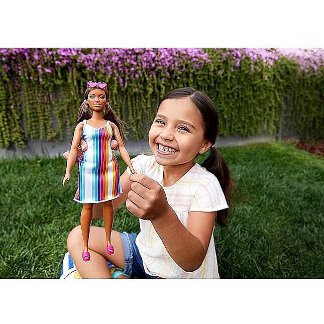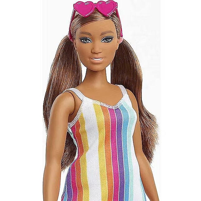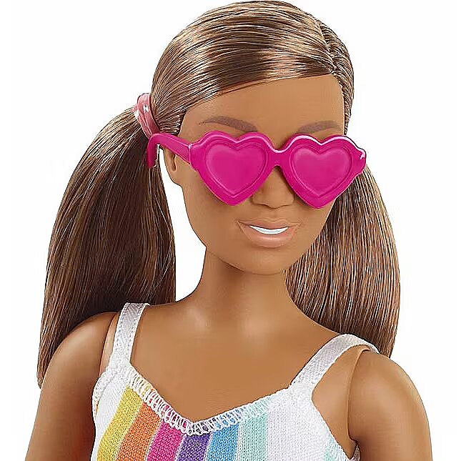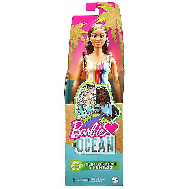LongDesc - Introducing Barbie Loves the Ocean, a doll line made from recycled plastics. Featuring fabrics and accessories made from recycled materials, these beach-bound Barbie dolls inspire all kinds of fun in the sun! This Barbie doll makes waves in a rainbow-striped sun dress with fabric made from recycled plastics. Trendy sunglasses, also made from recycled plastics, complete her summer-ready look. Featuring recyclable packaging and sun-sational looks with details kids love, Barbie Loves the Ocean dolls make great gifts for 3 to 7 year olds. Each sold separately, subject to availability. Doll cannot stand alone. Colors and decorations may vary.