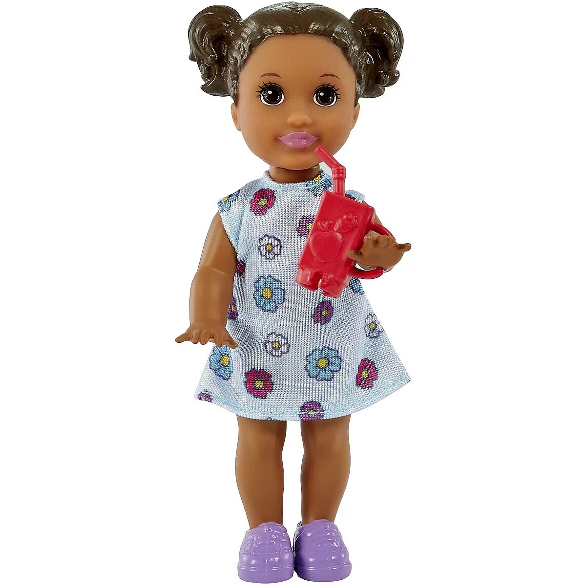 LongDesc - Explore a world of learning fun with the Barbie Teacher playset that lets kids explore their career aspirations. Barbie doll (blonde/11.5 in) wears an alphabet letter print dress with pink strappy shoes plus an adorable top-bun hairdo and is ready to teach! The playset comes with a flipping board that offers two lessons, a backpack, a toddler doll (brunette), toddler desk, scissors, student sheet and a drink to bring the storytelling to life. There's even a classroom pet turtle! And, with her laptop, Barbie doll is prepared to help students virtually, too. Kids will love trying on the teaching career hat and exploring their dream aspirations. Dolls cannot stand alone. Colours and decorations may vary. For ages 3 and up.