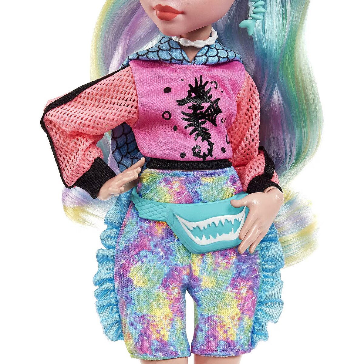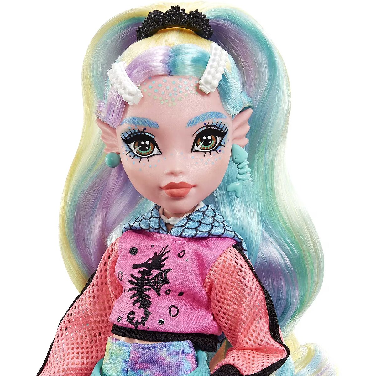 LongDesc - School is back in session, and the Monster High ghouls are showing up in scream-tastic style! Lagoona Blue doll struts down the Monster High hallways in a fin-tastic fashion featuring a hot-pink hoodie with mesh sleeves and a trendy, tie-dye bike shorts romper. Her gore-geous look is complete with a sea monster-inspired waist bag, seashell backpack, colourblock platform sandals and freaky-fabulous fin details inspired by her unique scaritage. Switch up Lagoona Blue doll's look with a 'metallic,' fish scale-detailed swimsuit, and inspire spooktacular storytelling with fearsome accessories and her creepy-cute pet fish, Neptuna! Doll cannot stand alone. Colours and decorations may vary.