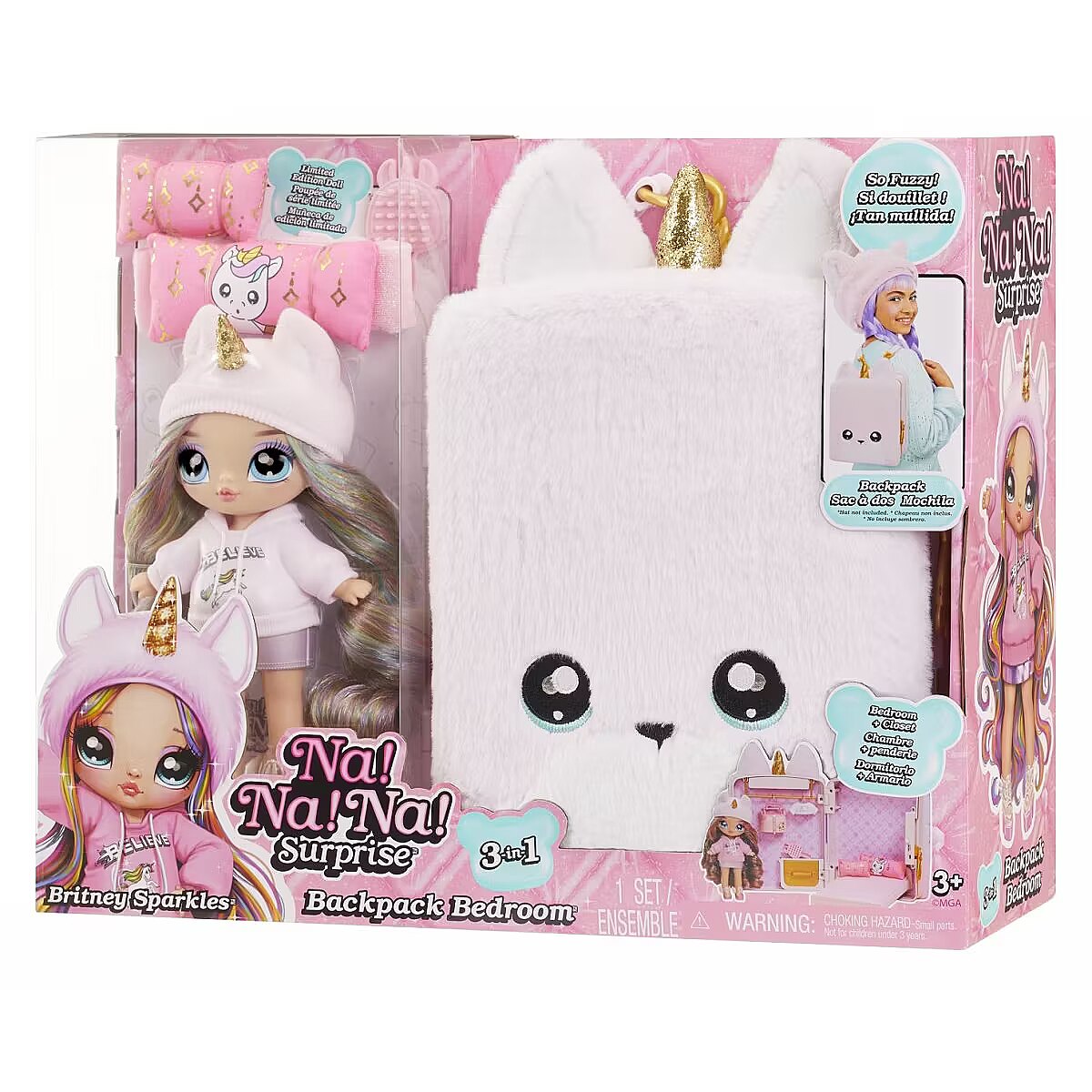 Description - Unbox the most fashionable playset for your dolls with the Na Na Na Surprise Backpack Bedroom. This adorable, soft playset is 3-in-1 a stylish, pink unicorn backpack, adorable bedroom playset with closet and soft articulated fashion doll, Britney Sparkles. The gorgeous backpack is soft and fuzzy and has a personality that totally matches Britney's unicorn style. Open it up to reveal a bedroom playset with fold-out bed, closet with working drawer, pillows, blanket, and hangers, all with cute, unicorn details. Britney has gorgeous, long rainbow-colored hair, a fuzzy unicorn hat, and she comes wearing an exclusive outfit and shoes. When finish playing, pack everything up and take the backpack on-the-go. There are two Na Na Na Surprise 3-in-1 Backpack Bedroom Unicorn Playset styles to collect: Britney Sparkles and Whitney Sparkles. Na Na Na Surprise soft fashion dolls and playsets are for collectors and kids girls and boys 4 to 10 years old and up who are animal-inspired fashionistas that are big on friendship, fabulosity, and all things cozy, soft, and fuzzy, including plush animal toys, surprises, and cute animal ears on everything! As birthday gifts and gifts for any special occasion, Na Na Na Surprise plush and glamorous dolls, stylish doll playsets and cute accessories provide all the feels and hours of social and imaginative pretend play with siblings and friends!