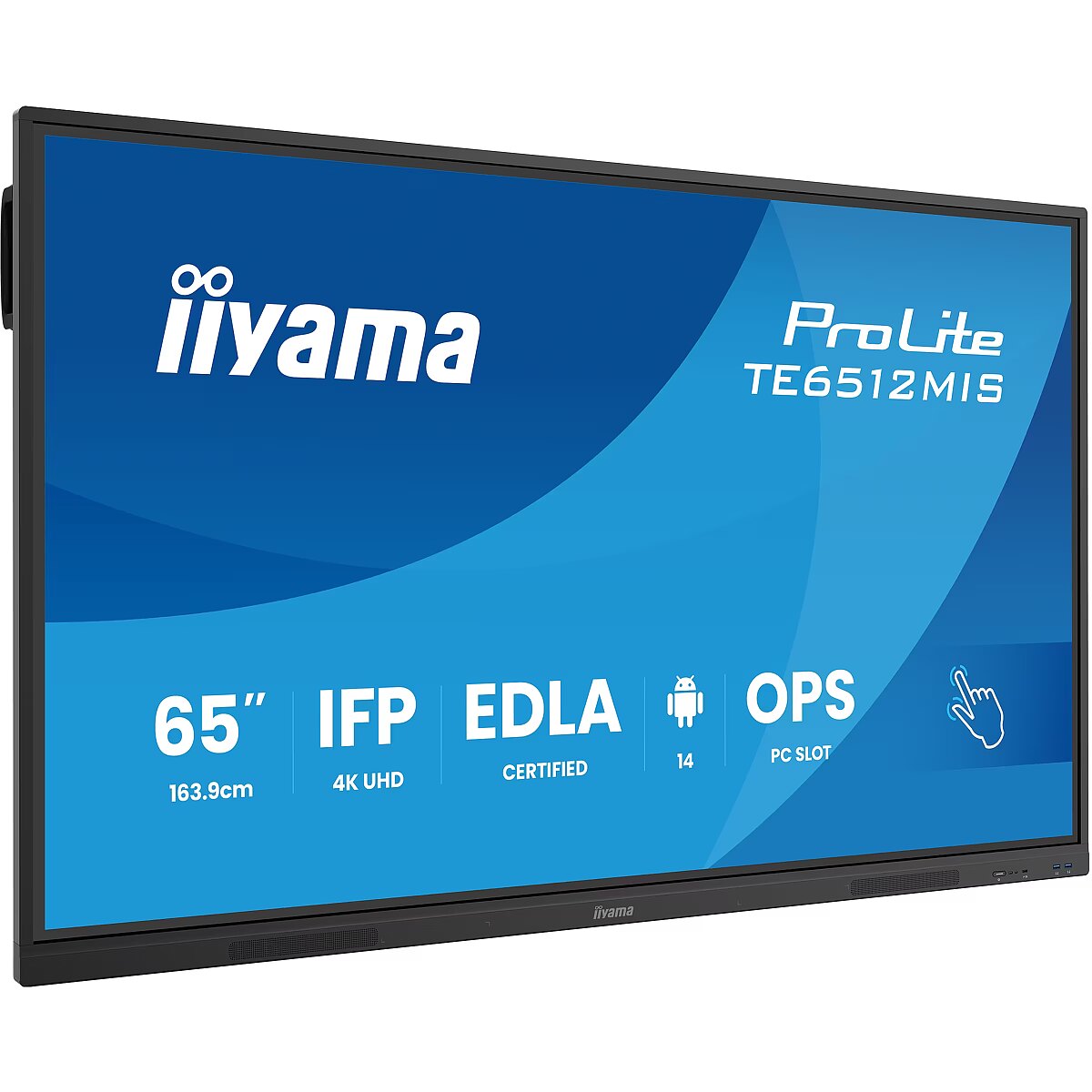 LongSummaryDescription - iiyama TE6512MIS-B4AG. Product design: Interactive flat panel. Display diagonal: 165.1 cm (65"), Display technology: LCD, Display resolution: 3840 x 2160 pixels, Display brightness: 400 cd/m², HD type: 4K Ultra HD, Touchscreen. Wi-Fi. Operating hours (hours/days): 24/7. Operating system installed: Android. Product colour: Black