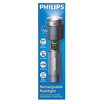 MediumDescription EN - The Philips rechargeable aluminium flashlight delivers powerful illumination of up to 1500 lumens with a beam distance of up to 660 metres. Designed for everyday and active use, it features IP44 water resistance, up to 12 hours of runtime and convenient USB-C charging, while the durable aluminium body ensures long-lasting reliability. • Brightness up to 1500 lumens• Beam distance up to 660 m• IP44 water resistance• Up to 12 hours of runtime• USB-C charging• Durable aluminium body