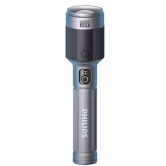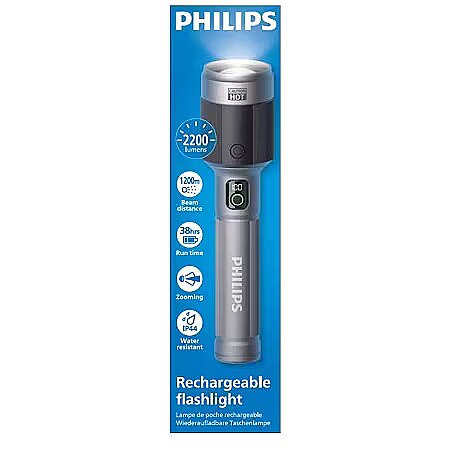 MediumDescription EN - The Philips rechargeable aluminium flashlight delivers extremely powerful illumination of up to 2200 lumens with an impressive beam distance of up to 1200 metres. Designed for demanding use, it features IP44 water resistance, up to 38 hours of runtime and USB-C charging, while the robust aluminium body ensures durability and reliability in tough conditions. • Brightness up to 2200 lumens• Beam distance up to 1200 m• IP44 water resistance• Up to 38 hours of runtime• USB-C charging• Durable aluminium body