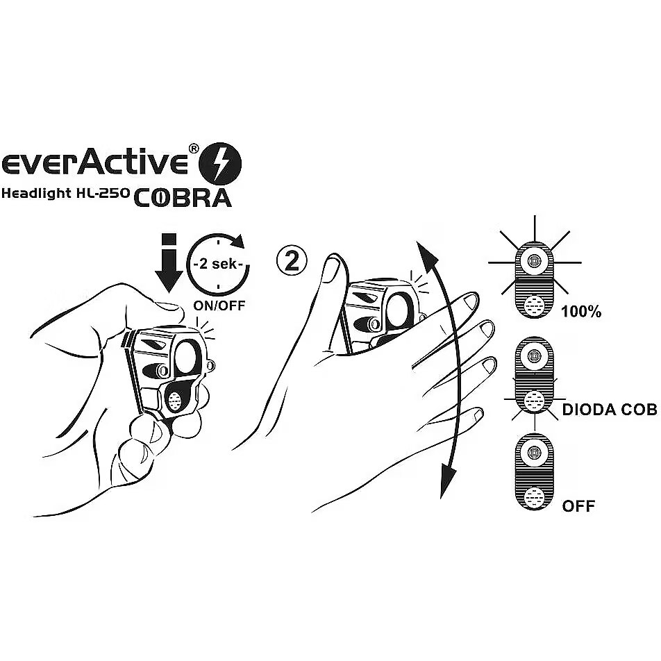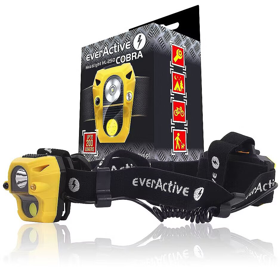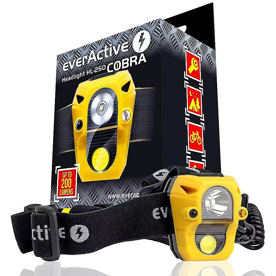 Description - Headlamp, LED headlamp everActive Cobra HL-250 2xLED SENSOR CREE XP-E2 3W LED in connection with the COB LED 3W provide 200 lumens output Universal provides an extra wide beam from the COB LED source and a focused long-range beam from the CREE LED source Additional proximity sensor allows contactless use of the flashlight 4 light modes: 100% CREE, 100% COB, 100% CREE + 100% COB, strobe Power supply: 3x AAA (not included)