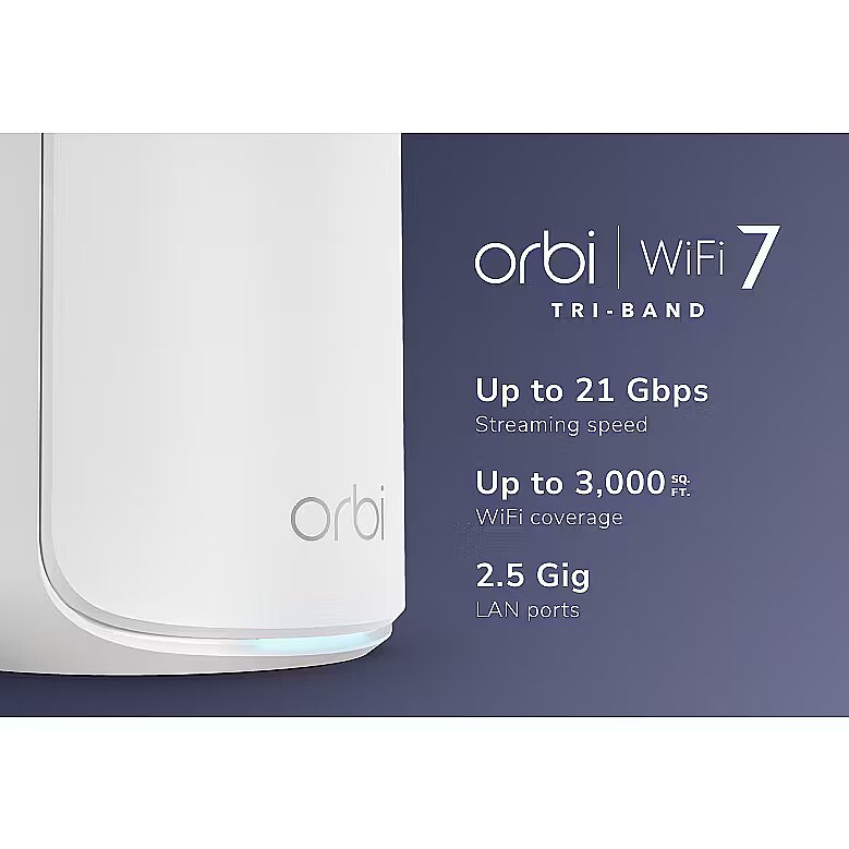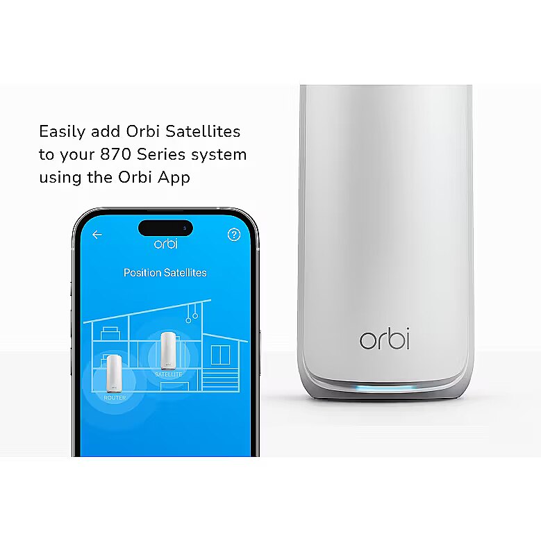 LongDesc - Expanding your Orbi™ system is as easy as the push of a button. Easily add 3,000 sq. ft. of additional WiFi 7 coverage to your existing Orbi 870 Series Mesh System- Up to 21 Gbps speeds Speeds up to 21 Gbps† for unparalleled performance and coverage for your whole home, from the front door to the back garden and the basement to the loft​- Tri-Band technology Tri-Band technology with Enhanced Backhaul ensures WiFi stays fast across all devices simultaneously​- Expandable WiFi coverageEasily add 3,000 sq. ft. of additional WiFi 7 coverage to your existing Orbi 870 Series mesh system- 360° WiFi Coverage ​Elegant, new design and high-performance antennas provide exceptional 360° WiFi coverage across every corner of your home, no matter the layout​- Reimagined speed & reliability2.5 Gbps†† Ethernet ports unlock unbeatable speed and reliability for wired connections and 2.5 Gbps wired backhaul option​- Easy Set Up​Simply power on Orbi satellite and set it up with the Orbi app​How many Orbi Satellites do you need?- COVERAGE AREAConsider square footage beyond your home footprint to maximize performance and ensure coverage for outdoor areas.- HOME SHAPEL or U-shaped homes may need additional satellites to extend WiFi around corners.- WIRED CONNECTIONSOrbi satellites give your ultra-fast wired connections where you need them.- CONSTRUCTION MATERIALSBrick and concrete weaken WiFi signals. Add-on satellites will strengthen WiFi coverage.Orbi works with any internet provider.From AT&TTM to Cox, Spectrum, Verizon, Xfinity®, and everything in between, there’s no need to worry about compatibility. Simply plug Orbi into your current modem and you’ll be enjoying whole-home WiFi in a few easy steps.