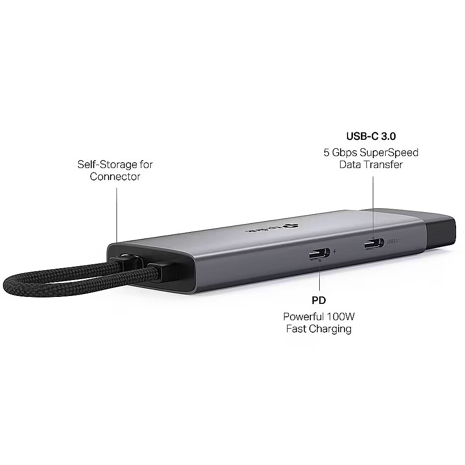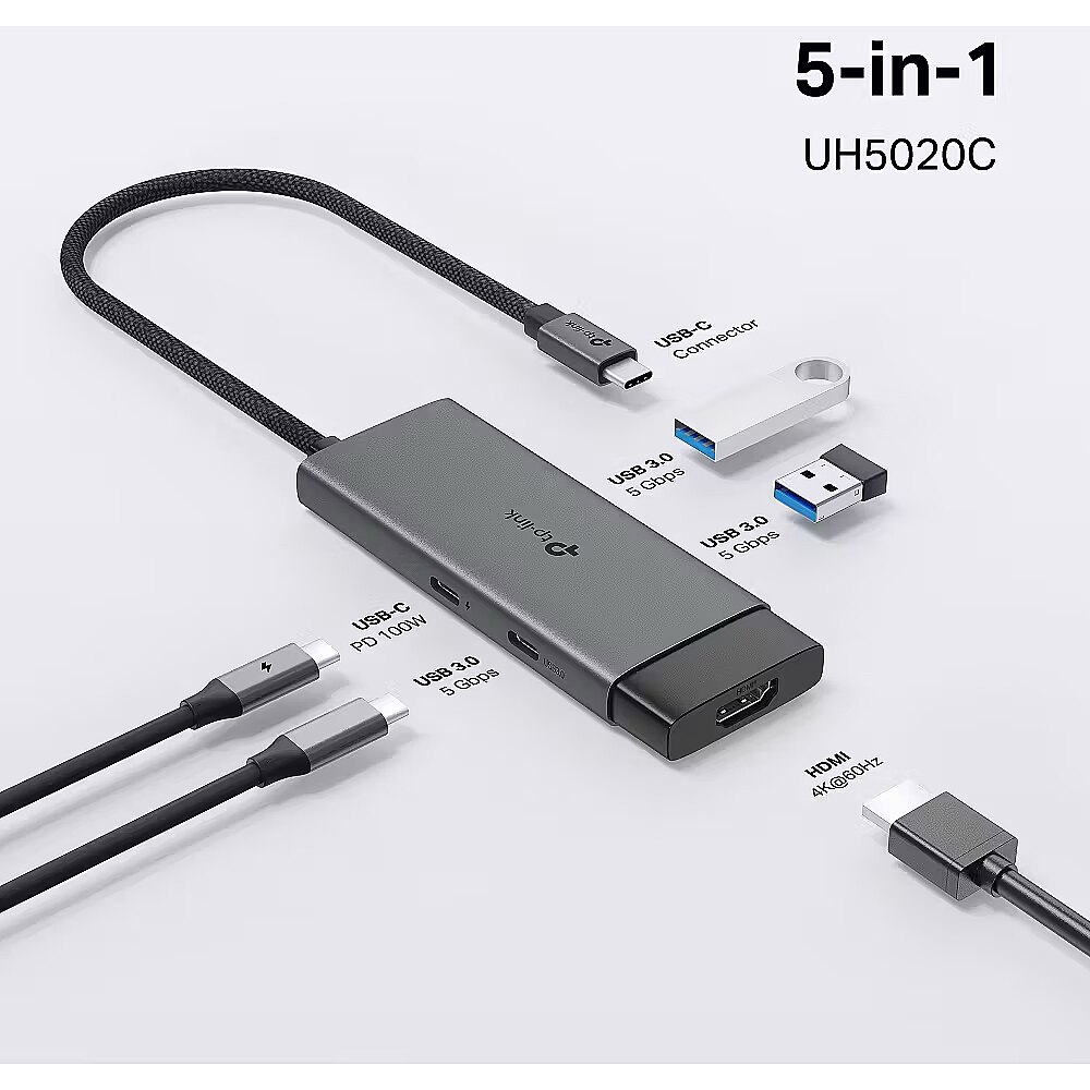 LongDesc - 5 in 1 USB-C HubUH5020C turns a single USB-C port into 5 ports with a 4K@60Hz HDMI, 100W Power Delivery, 1× USB-C Data Port, 2× USB-A Data Ports.Ultra High-Definition Media DisplayConnect to an external monitor via the 4K@60Hz HDMI port for a stunning ultra high-definition experience.Powerful 100W Fast ChargingPlug the charging cable into UH5020C and continuously deliver up to 100W of power to your PC while transferring files or streaming media.5 Gbps SuperSpeed Data TransferUH5020C adds three USB 3.0 ports to your device, enabling simultaneous use of multiple USB devices.Easy to Use with Plug & PlaySimply plug in and start using in seconds, thanks to driver-free install with Mac OS, Windows 11/10/8.1/8/7, Linux OS, iPadOS, iOS, Android, Chrome OS, and Nintendo OS.Compact and Elegant DesignThe self-storing design not only protects the connector, but also but also improves portability. Aluminum alloy case and braided cable make UH5020C more durable. Bring you a better user experience.