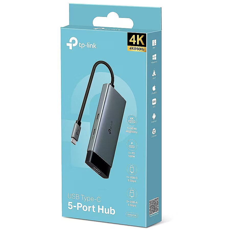 LongSummaryDescription - TP-Link UH5020C. Host interface: USB Type-C, Hub interfaces: HDMI, USB 3.2 Gen 1 (3.1 Gen 1) Type-A, USB Type-C. Data transfer rate: 5000 Mbit/s, Maximum refresh rate: 60 Hz, Supported video modes: 2160p. Power supply type: USB. Windows operating systems supported: Windows 10, Windows 11, Windows 7, Windows 8, Windows 8.1, Mac operating systems supported: MacOS, Other operating systems supported: Android, ChromeOS, iOS, iPadOS. Width: 108.2 mm, Depth: 40 mm, Height: 12.2 mm