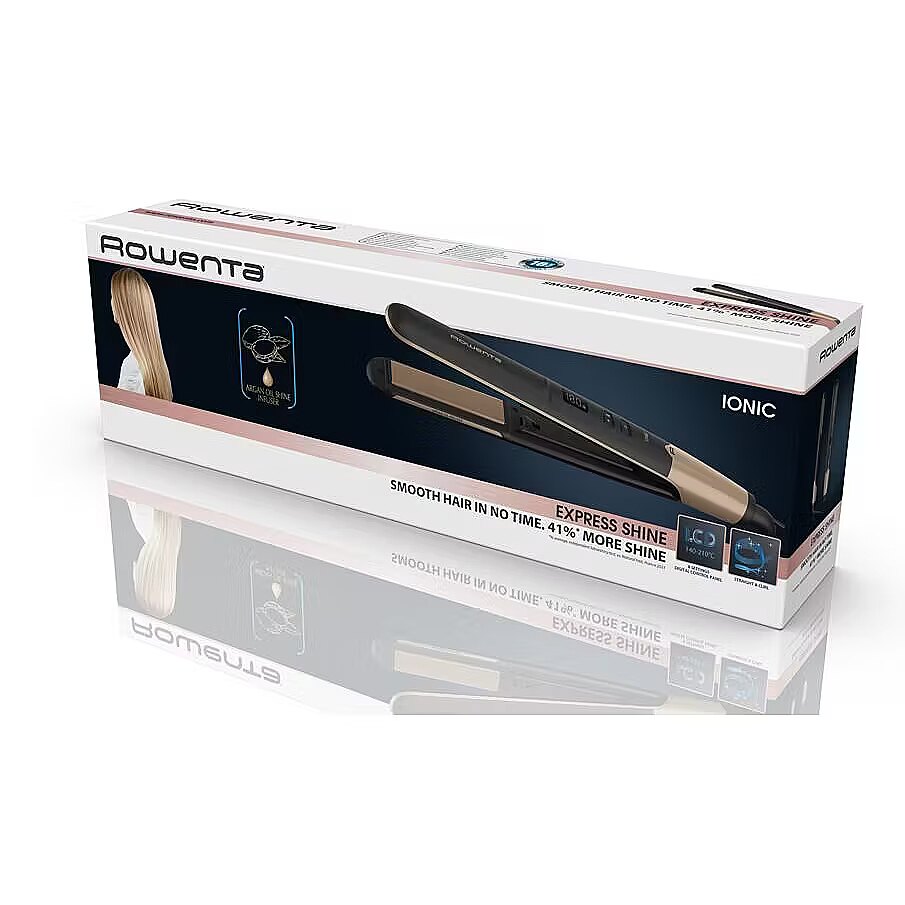 MediumDescription EN - For glamourous shine that never fails to turn heads, the Rowenta Express Shine Hair Straightener is your new styling ally for gorgeous looks day after day. Experience a whole new level of radiant glow thanks to argan-oil infuser and ceramic plates combined with the static-reducing ionic effect for effortless glide and silky-smooth results. • An advanced ceramic coating glides smoothly through your hair