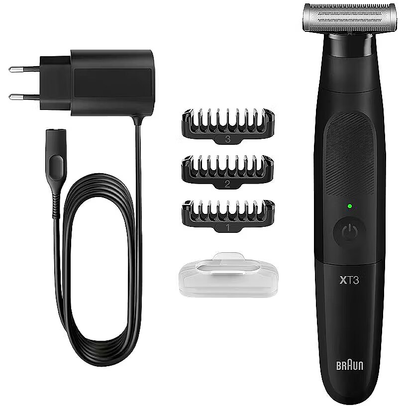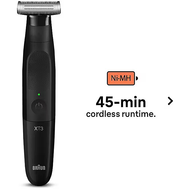 LongSummaryDescription - Braun XT3100. Product colour: Black, Minimum hair length: 1 mm, Maximum hair length: 3 mm. Power source: Battery, Operating time: 45 min, Battery type: Built-in battery. Height: 185.4 mm, Battery weight: 26 g. Package width: 56 mm, Package depth: 125.5 mm, Package height: 220 mm. Quantity per pack: 1 pc(s), Master (outer) case width: 141 mm, Master (outer) case length: 186 mm