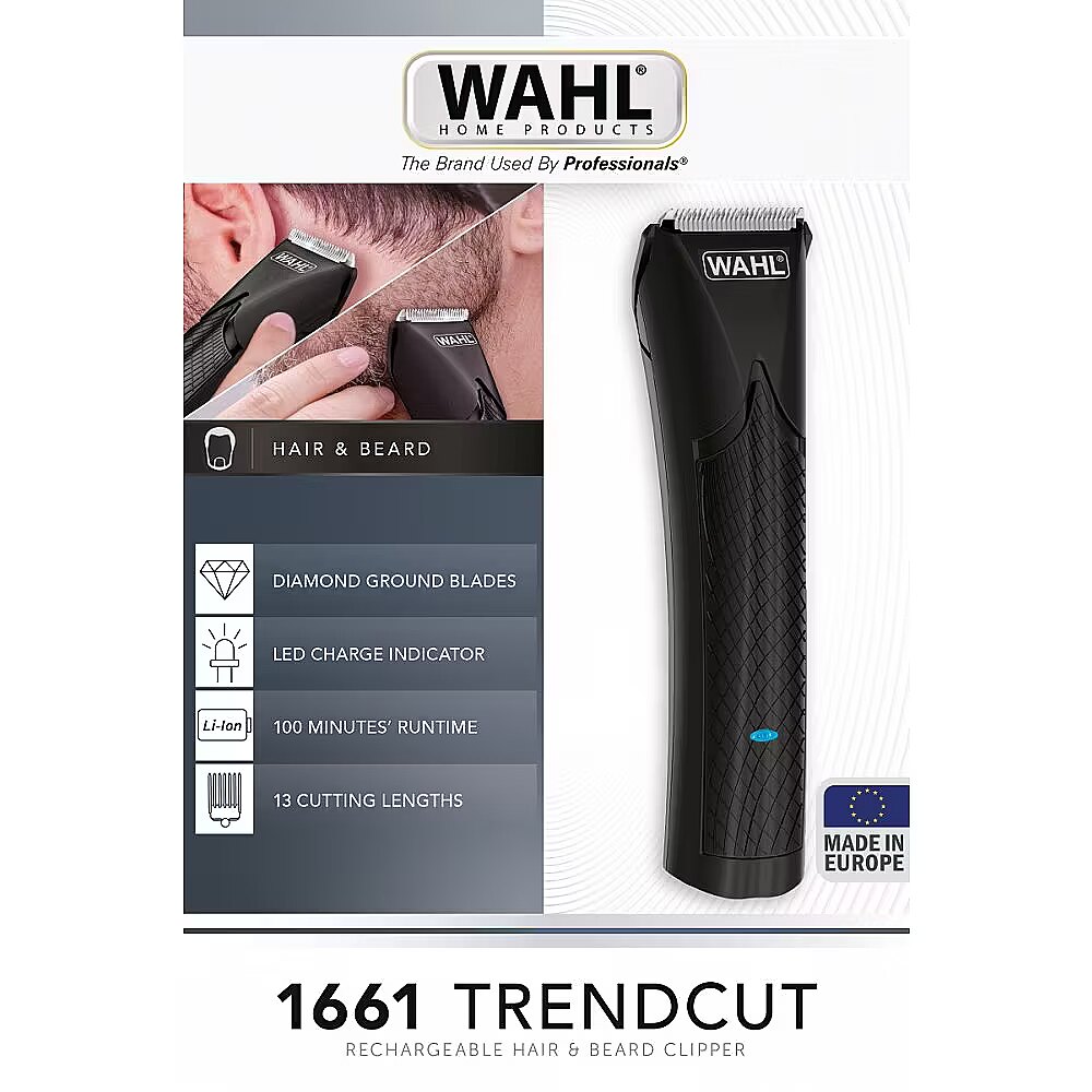Description - Maszynka do strzyżenia Wahl 1661-0465 TrendCut Wahl 1661-0465 to jeden z najwyższych modeli maszynki do strzyżenia w ofercie marki Wahl - to połączenie solidnego niemieckiego projektu firmy Moser z amerykańską technologią firmy Wahl - wynalazcy elektrycznej maszynki do włosów, jedynej na świecie firmy produkującej maszynki do włosów dla NASA. Ma wszystko, czym charakteryzuje się wysokiej jakości maszynka do strzyżenia. Po pierwsze rewelacyjne ostrze niemieckiej produkcji, stalowe, samoostrzące, nierdzewne, diamentowo szlifowane - ostrze którym można strzyc włosy i brodę (Hair&Beard Blade). Po drugie nowoczesny akumulator litowo-jonowy, który gwarantuje do 100 minut bezprzewodowej pracy i posiada funkcję szybkiego ładowania 1 minuta ładowania = 3 minuty pracy maszynki. Po trzecie wygoda operowania, na którą składa się kształt maszynki oraz jej lekkość. Po czwarte duży kompletny zestaw akcesoriów. Wystarczy wziąć ją do ręki, aby poczuć, jak idealnie leży w dłoni i jak wygodnie się nią operuje. Specyfikacja: Maszynka bezprzewodowa Profesjonalne samoostrzące, stalowe, nierdzewne ostrze o szerokości 40mm, diamentowo szlifowane, wymienne Łatwe czyszczenie - korpus z ostrzem zdejmuje się jednym delikatnym ruchem Bardzo mocny profesjonalny litowo-jonowy akumulator, wystarczający na 100 minut bezprzewodowej pracy Tryb szybkiego ładowania: po 1 minucie ładowania maszynka jest gotowa do natychmiastowego użycia Długość pełnego ładowania do 4h Możliwość używania bezprzewodowo, jak również z podłączonym zasilaczem (zasilanie sieciowo-akumulatorowe) Uniwersalne napięcie, pozwalające na używanie maszynki na całym świecie: 110 - 240 V, 50/60Hz Minimalna długość cięcia maszynki 0.9 mm 12 nakładek grzebieniowych - 1.5, 2, 2.5, 3, 4.5 , 6, 9, 12, 16, 18, 22 i 25 mm Ergonomiczny kształt i antypoślizgowy uchwyt ułatwiają strzyżenie