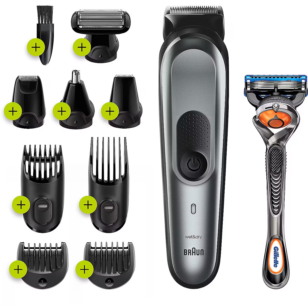 Technical details > Accessories included - Comb 3 - 10 mm; Comb 11 - 21 mm; Fixed combs with 1 mm & 2 mm; Body groomer; Ear & nose trimmer; Detail trimmer; Mini foil shaver; Gillette Fusion5 ProGlide razor; Charging stand; Cleaning brush; SmartPlug; Soft pouch